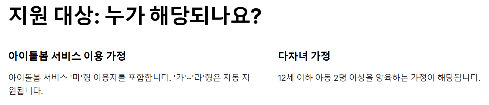 - 신청 대상은 아이돌봄 마형 이용자이며, 가~라형은 자동 지원됩니다.