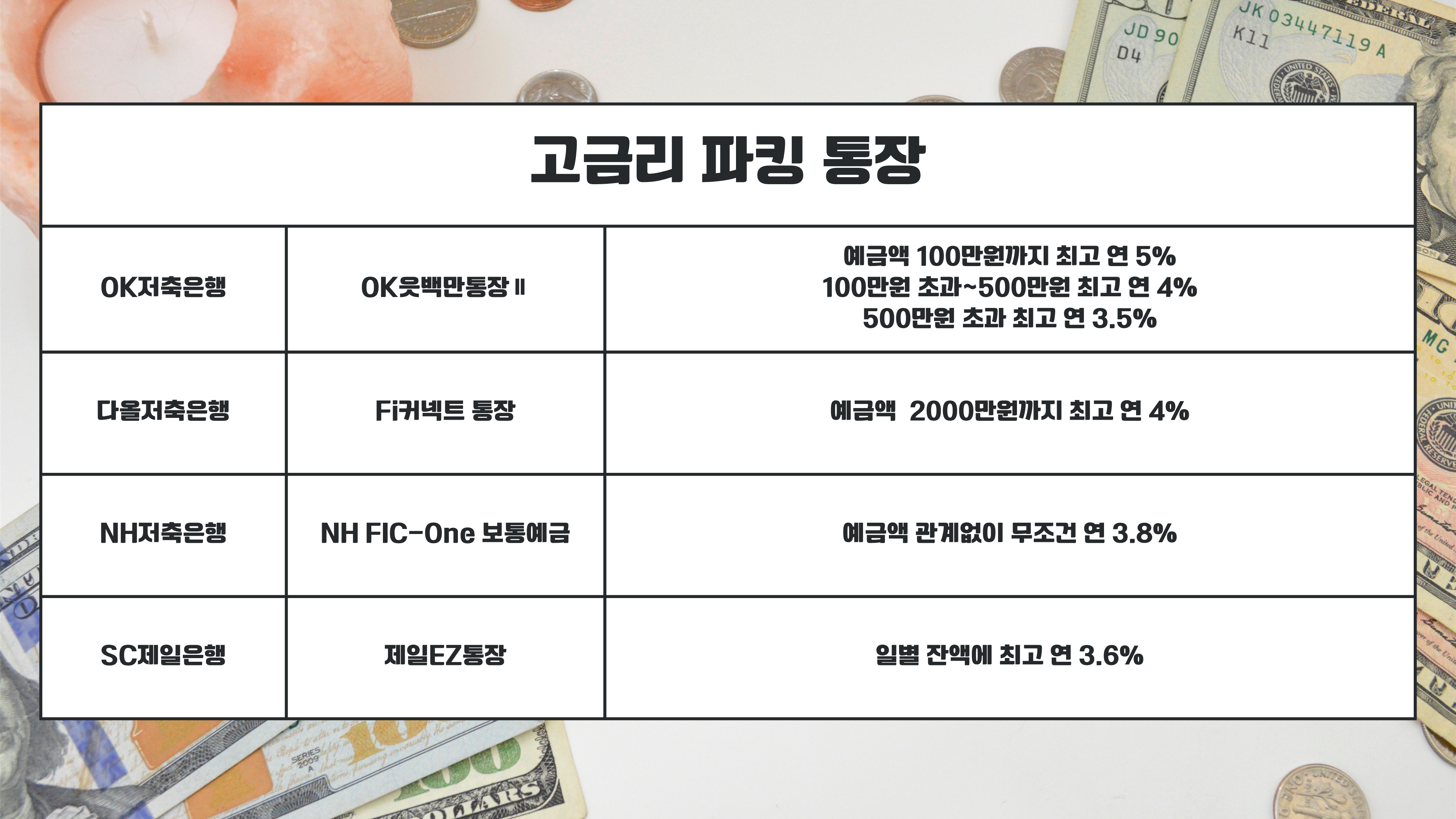 파킹통장은 OK저축은행, 다올저축은행, NH저축은행, SC제일은행에서 연3~5% 금리 혜택을 받을 수 있다고 합니다.
