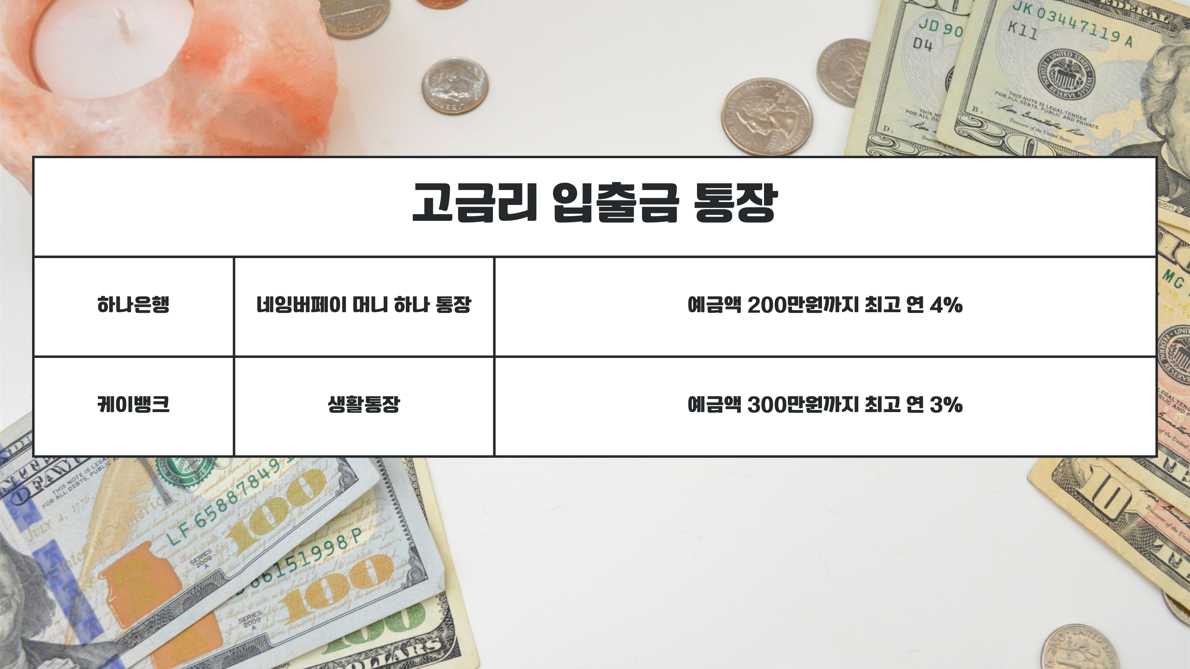 입출금 통장 부분은 하나은행과 케이뱅크에서 연 3~4%의 금리 혜택을 받을 수 있는 통장을 제공합니다