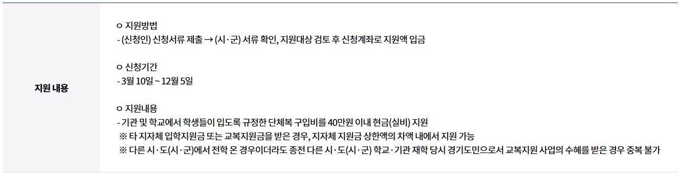- 지원 내용: 학생들이 입도록 규정한 단체복 구입비를 40만원 이내로 현금 지원한다.