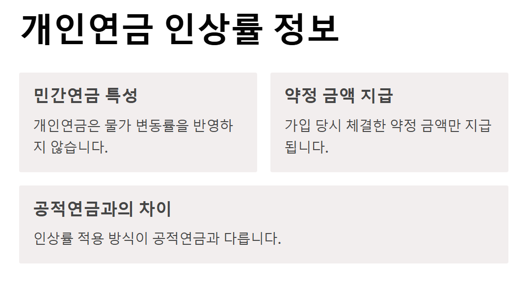 - 인상률 적용 차이: 국민연금 등 공적 연금과 민간 개인 연금은 인상률을 별도로 적용한다는 점을 유의해야 한다.