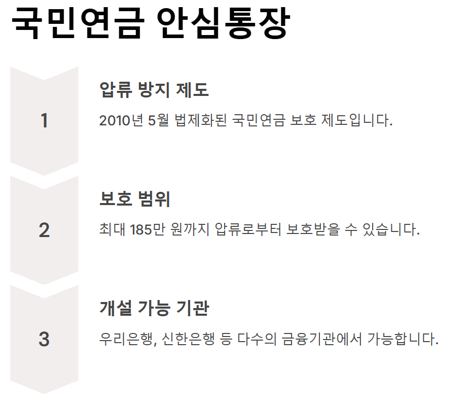- 안심통장 필요성: 이러한 상황을 방지하기 위해 국민연금 안심통장을 미리 만들어 두는 것이 필요하다.