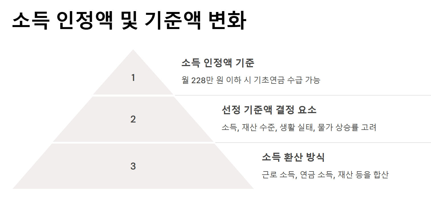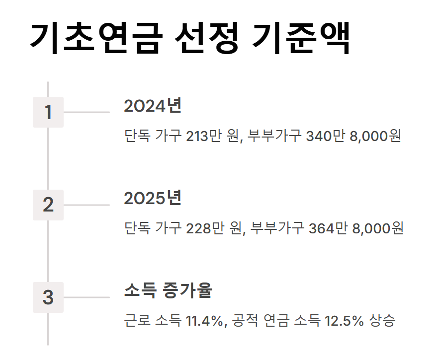 - 소득 인정액 기준: 2025년 노인 단독가구 소득 인정액이 월 228만 원 이하일 경우 기초연금을 받을 수 있다.