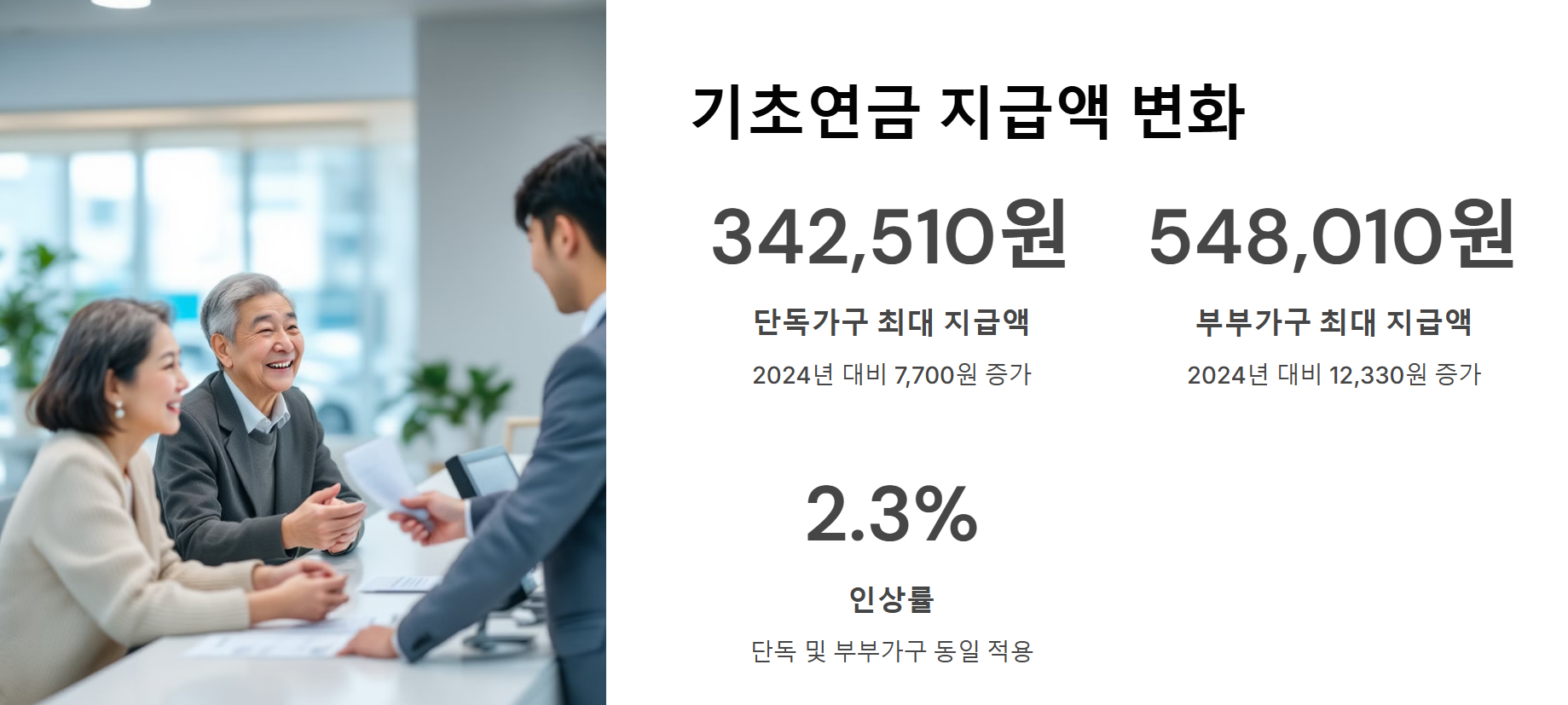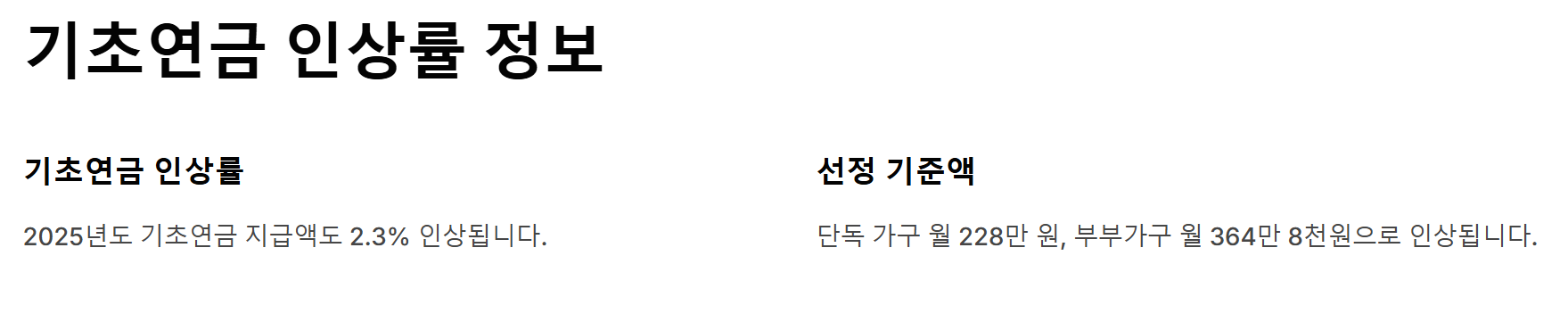- 기초연금 인상률: 2025년도 기초연금 지급액도 2.3% 인상된다.