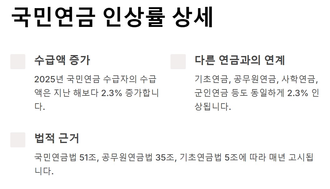 - 2025년 인상률: 2025년 국민연금 인상률은 **2.3%**로 결정되었다.
