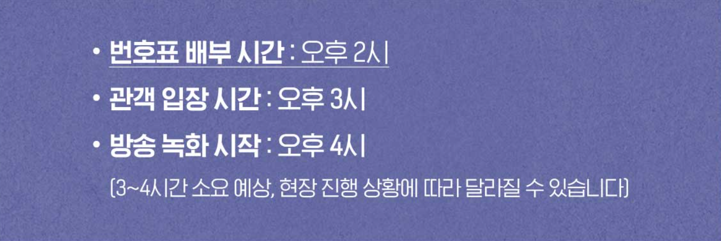3) 번호표 배부 시간 사전 확인 부탁드립니다. 이 시간 보다 일찍 오시는 방청객분들에 대해서는 안전 문제로 인해 티켓 배부가 되지 않을 수 있습니다