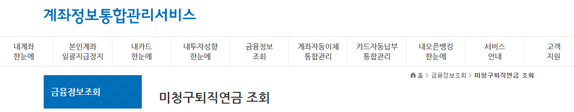 위 링크로 들어가면 '미청구 퇴직연금 조회' 서비스로 바로 이동이 가능합니다.