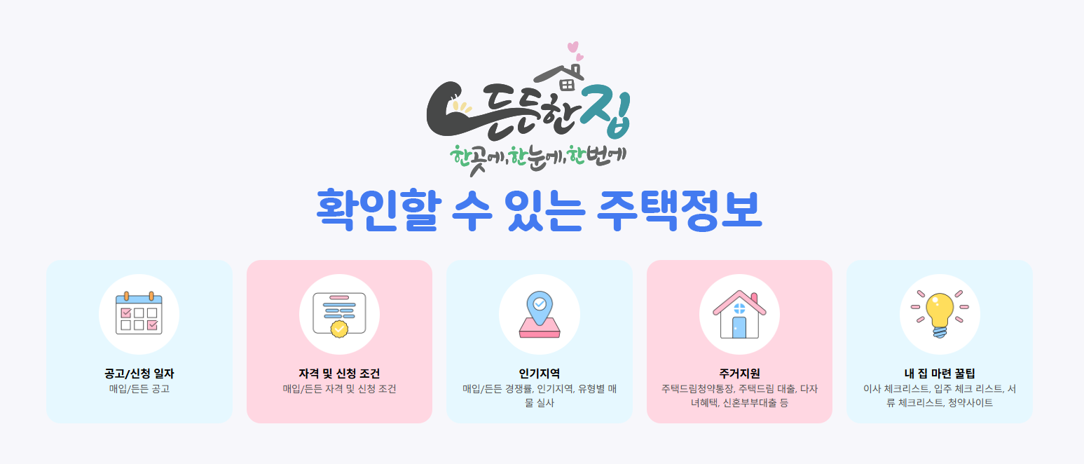 ‘든든한 집’은 국토교통부에서 운영하는 주거정보 통합 포털입니다. 매입임대, 전세임대, 청약, 대출 등 주거지원제도를 한곳에서 소개해 누구나 쉽게 접근할 수 있게 도와줍니다.