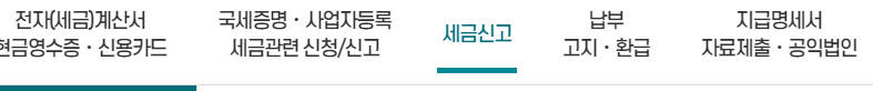 홈택스 홈페이지 들어가서 맨 위에 있는 메뉴 중 '세금신고'에 마우스를 대면 아래 세부 메뉴가 생깁니다