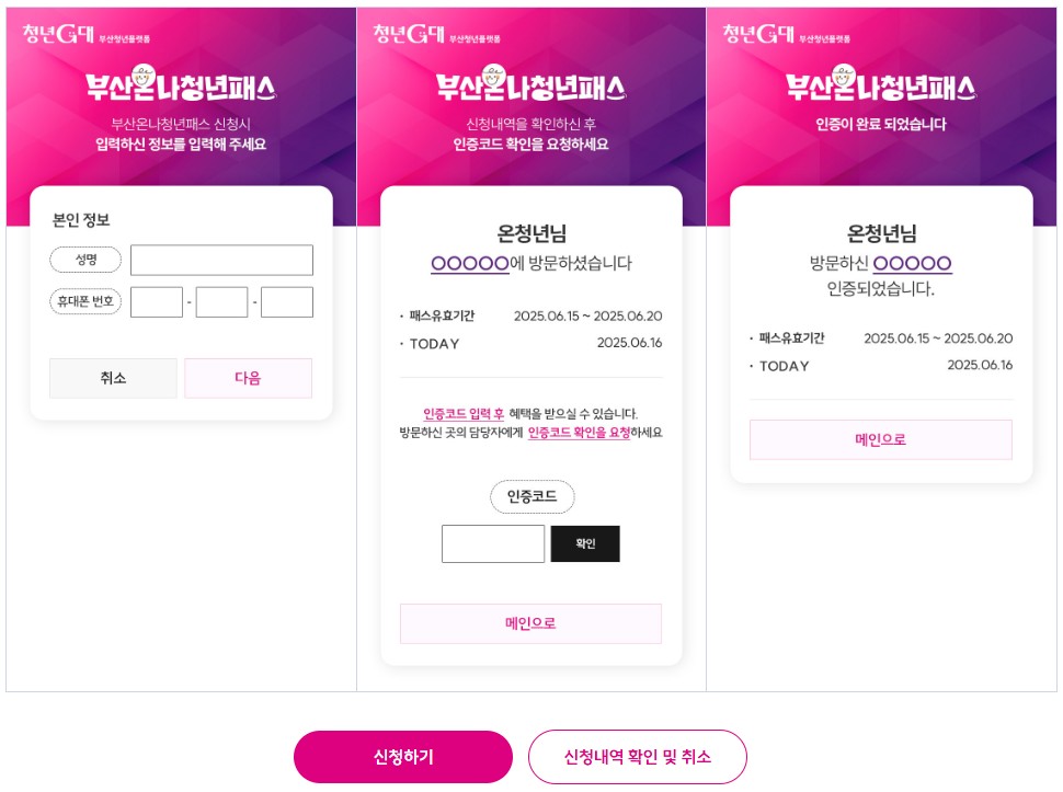 신청방법: 부산청년플랫폼 접속 → 온나청년패스 메뉴 → 숙박 예약서류(숙박업소명, 숙박일자 기재된 서류) 첨부 후 신청