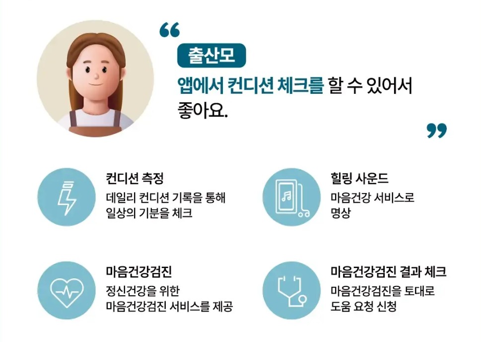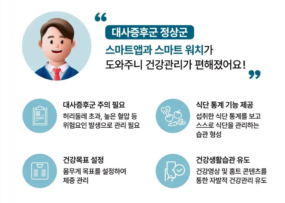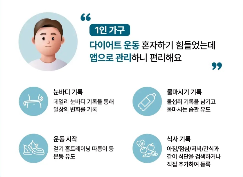 고령자, 출산모, 1인 가구, MZ세대 등 다양한 대상자를 위한 기능이 포함되어 있습니다. 데일리 식단/물섭취/운동 기록, 마음건강 체크, 홈트레이닝 영상, 챌린지 등으로 구성되어 있습니다.