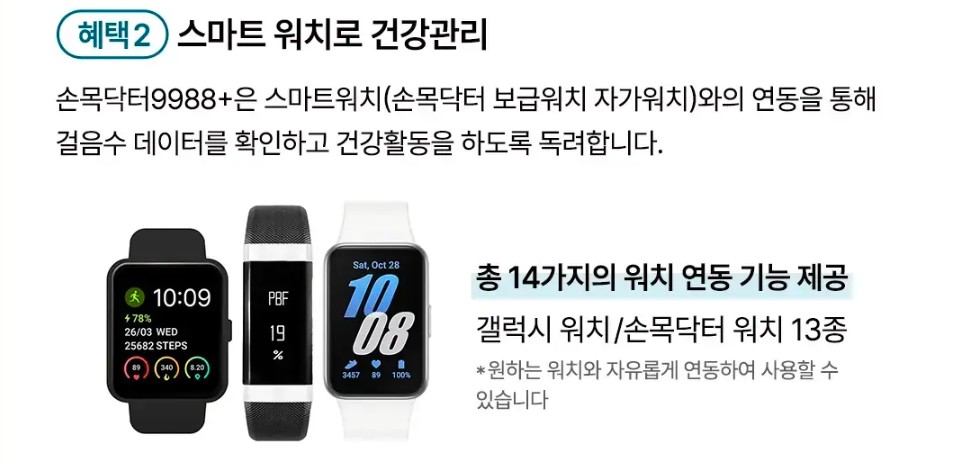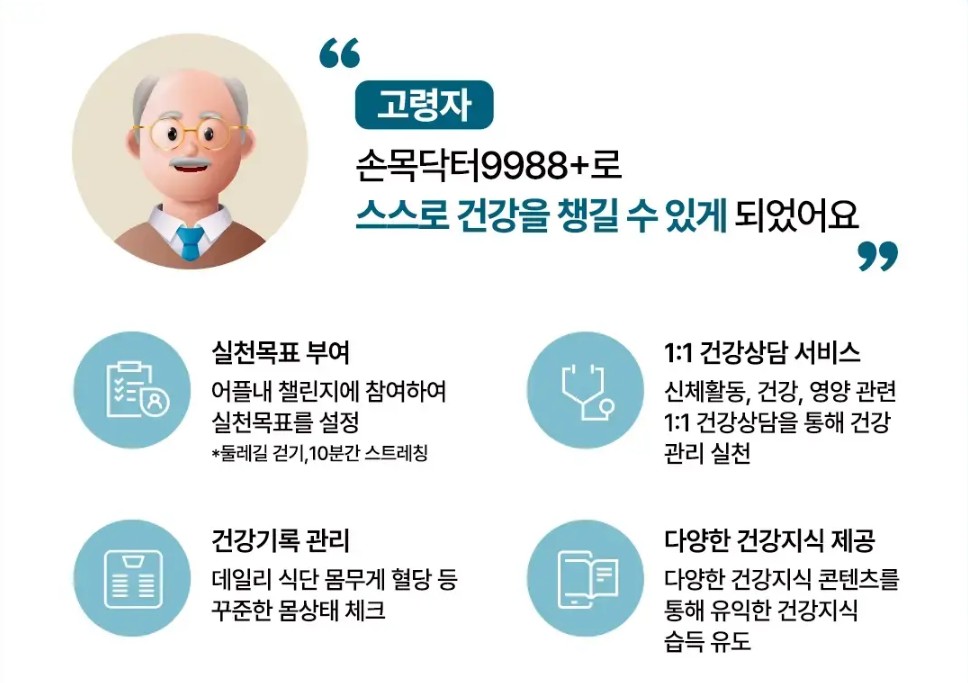 '손목닥터9988+'는 서울시민이 스마트워치와 전용 앱을 통해 자가 건강관리를 실천할 수 있도록 돕는 건강 프로그램입니다. '99세까지 팔팔하게'라는 슬로건 아래, 만보기 기반 걷기, 식단관리, 건강상담 등 다양한 서비스가 제공됩니다.