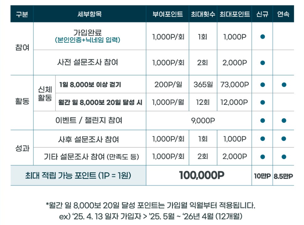 | 하루 8,000보 | 200p | 매일 최대 365회 |