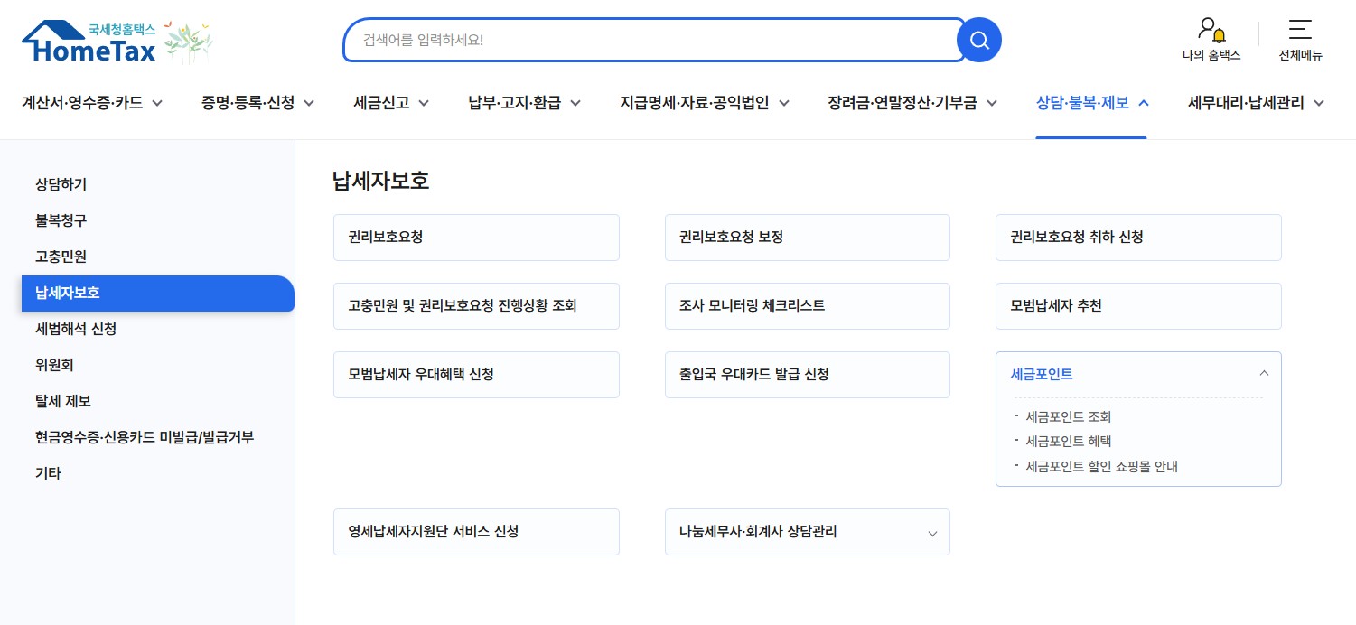 홈택스 누리집에 접속 후 ‘납세자보호’ 메뉴에서 ‘세금포인트 조회’를 선택하면 포인트 누적 현황, 사용 가능 포인트, 사용 내역 등을 쉽게 확인할 수 있습니다.