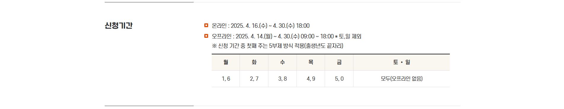 온라인 신청은 2025년 4월 16일부터 4월 30일까지이며, 안동시청 누리집에서 성인 본인에 한해 신청이 가능합니다. 오프라인 신청은 2025년 4월 14일부터 4월 30일까지(오전 9시~오후 6시, 토요일과 일요일 제외) 주소지 읍·면·동 행정복지센터를 방문하여 신청하면 됩니다. 신청 기간 중 첫째 주는 출생년도 끝자리에 따라 5부제 방식이 적용됩니다.