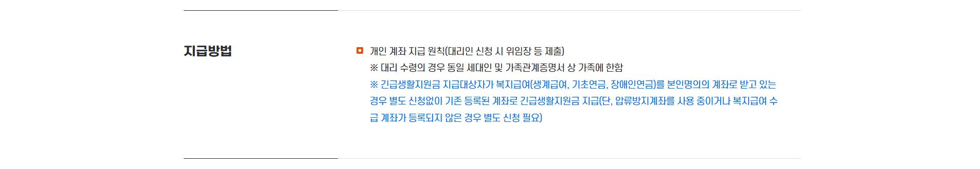 지원 금액은 1인당 30만 원이며, 지급 방식은 개인 명의 계좌로 현금 계좌이체됩니다. 복지급여(생계급여, 기초연금, 장애인연금)를 본인 명의 계좌로 받고 있는 경우, 별도 신청 없이 기존 등록된 계좌로 지급됩니다. 단, 압류방지계좌를 사용 중이거나 복지급여 수급 계좌가 등록되지 않은 경우에는 별도 신청이 필요합니다.