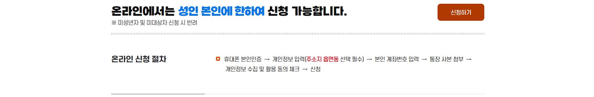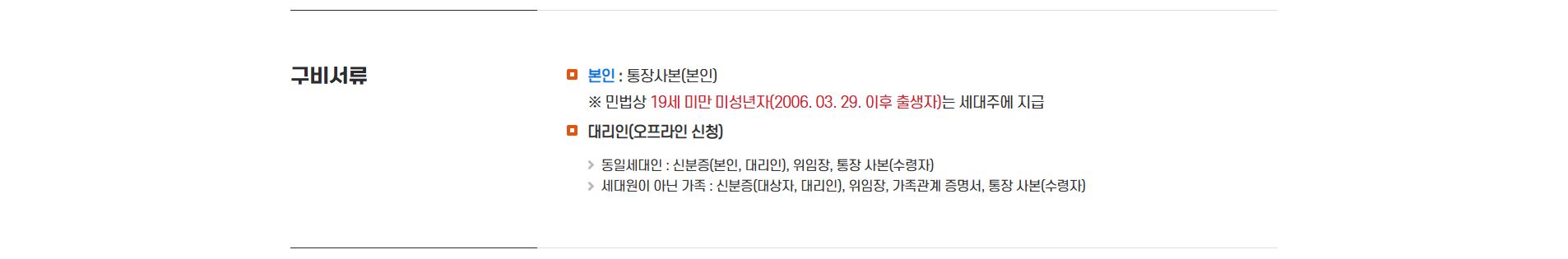 본인 신청 시에는 신분증과 본인 명의 통장 사본이 필요합니다. 대리인 신청 시에는 신청자 및 대리인의 신분증, 위임장, 수령인 통장 사본, 가족관계증명서 또는 주민등록등본이 필요합니다. 대리 수령은 동일 세대원이나 가족관계증명서 상 가족에 한해 가능하며, 가족이 아닌 경우 대리 수령은 불가합니다.