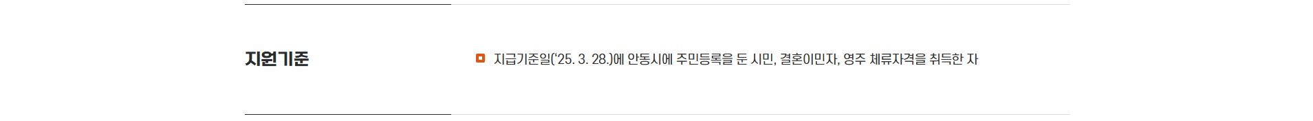 2025년 3월 28일 기준으로 주민등록상 안동시에 거주하는 시민이 지원 대상입니다. 이는 결혼이민자나 영주권자도 포함되며, 안동시 거주 사실을 증명할 수 있는 자료를 제출하면 지원이 가능합니다.
