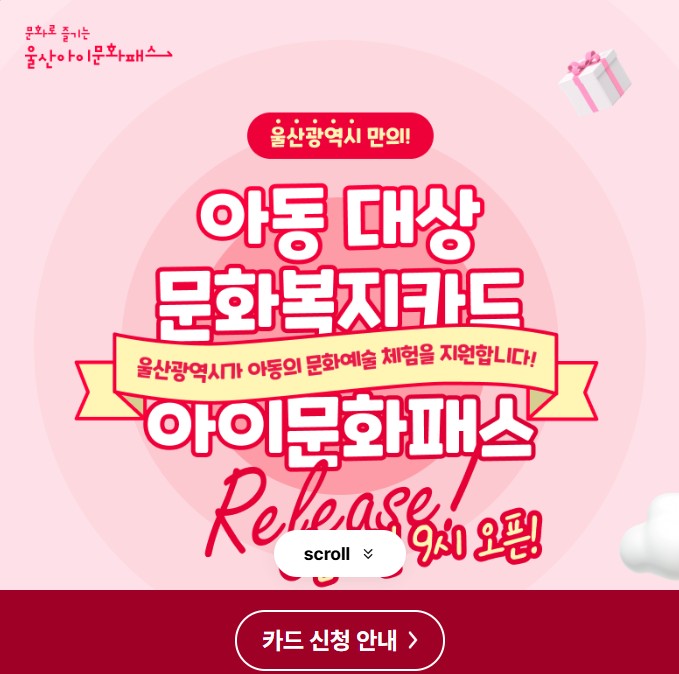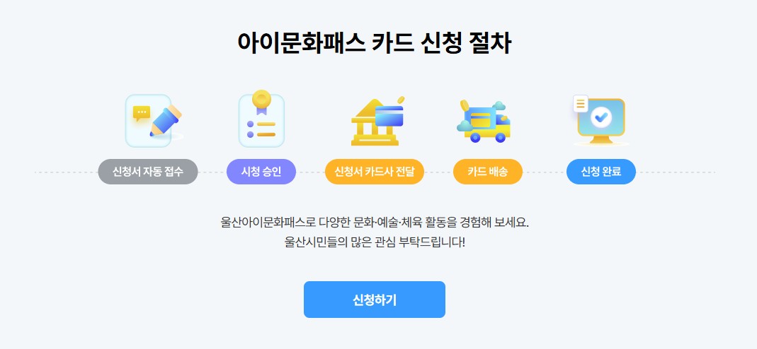울산시청 아이문화패스 공식 홈페이지에서 온라인 신청이 가능합니다.