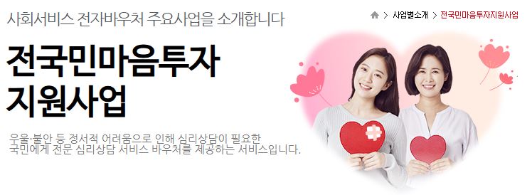 전국민 마음투자 지원사업은 보건복지부 주관으로 진행되며, 국민들이 정서적 안정과 건강을 유지할 수 있도록 돕기 위한 프로그램입니다. 이 사업의 목적은 국민의 마음 건강을 증진하고, 조기 발견 및 예방을 통해 정신질환의 발생을 줄이는 것입니다.
