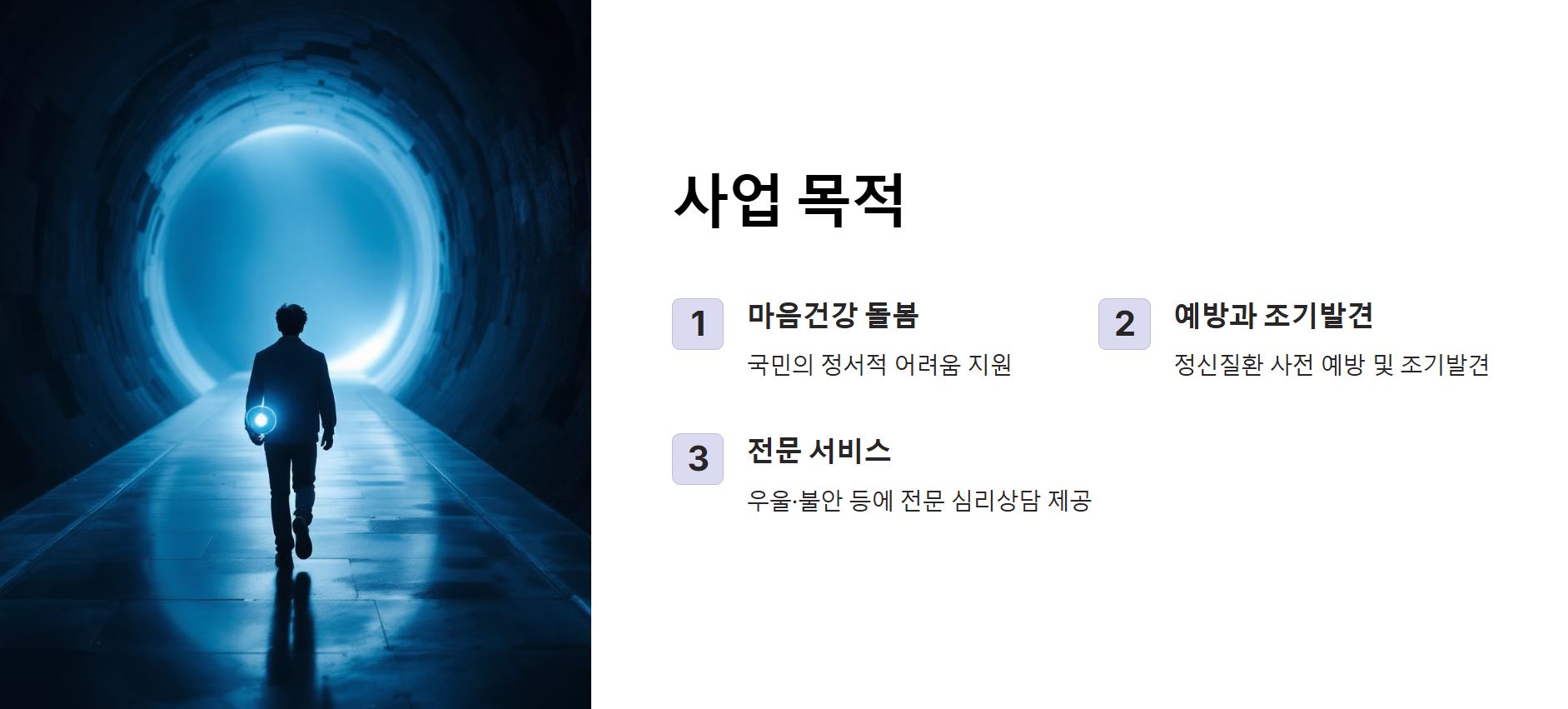 현대 사회에서는 스트레스와 불안이 증가하고 있으며, 이는 많은 사람들이 심리적 어려움을 겪게 만드는 원인이 됩니다. 이러한 상황에서 전문적인 심리상담 서비스는 국민들이 정서적 문제를 해결하고, 더욱 건강한 삶을 살 수 있도록 돕는 중요한 역할을 합니다. 특히, 코로나19 팬데믹 이후 많은 사람들이 심리적 어려움을 겪고 있는 만큼, 이러한 사업이 더욱 필요하다고 할 수 있습니다.