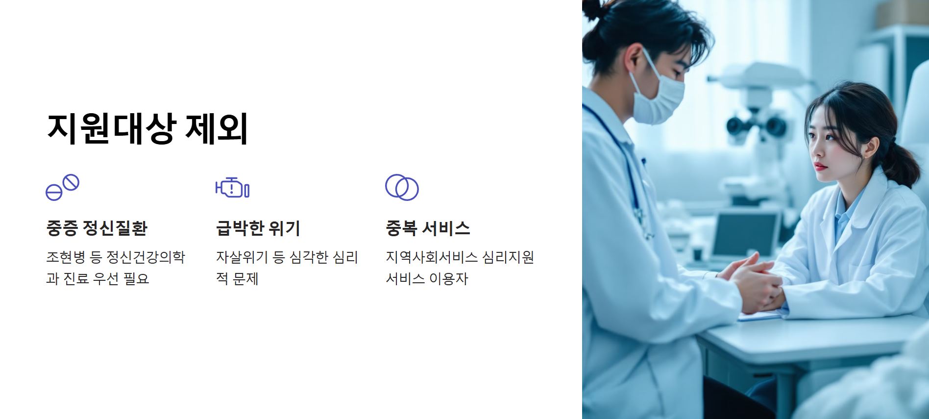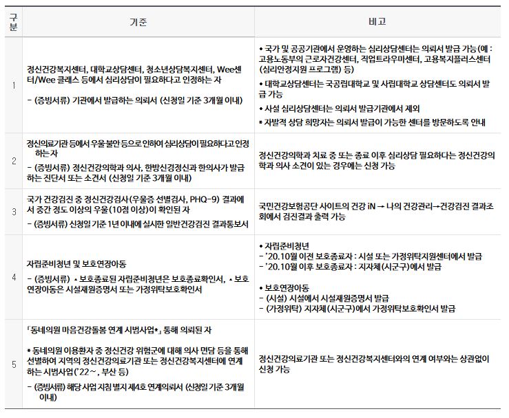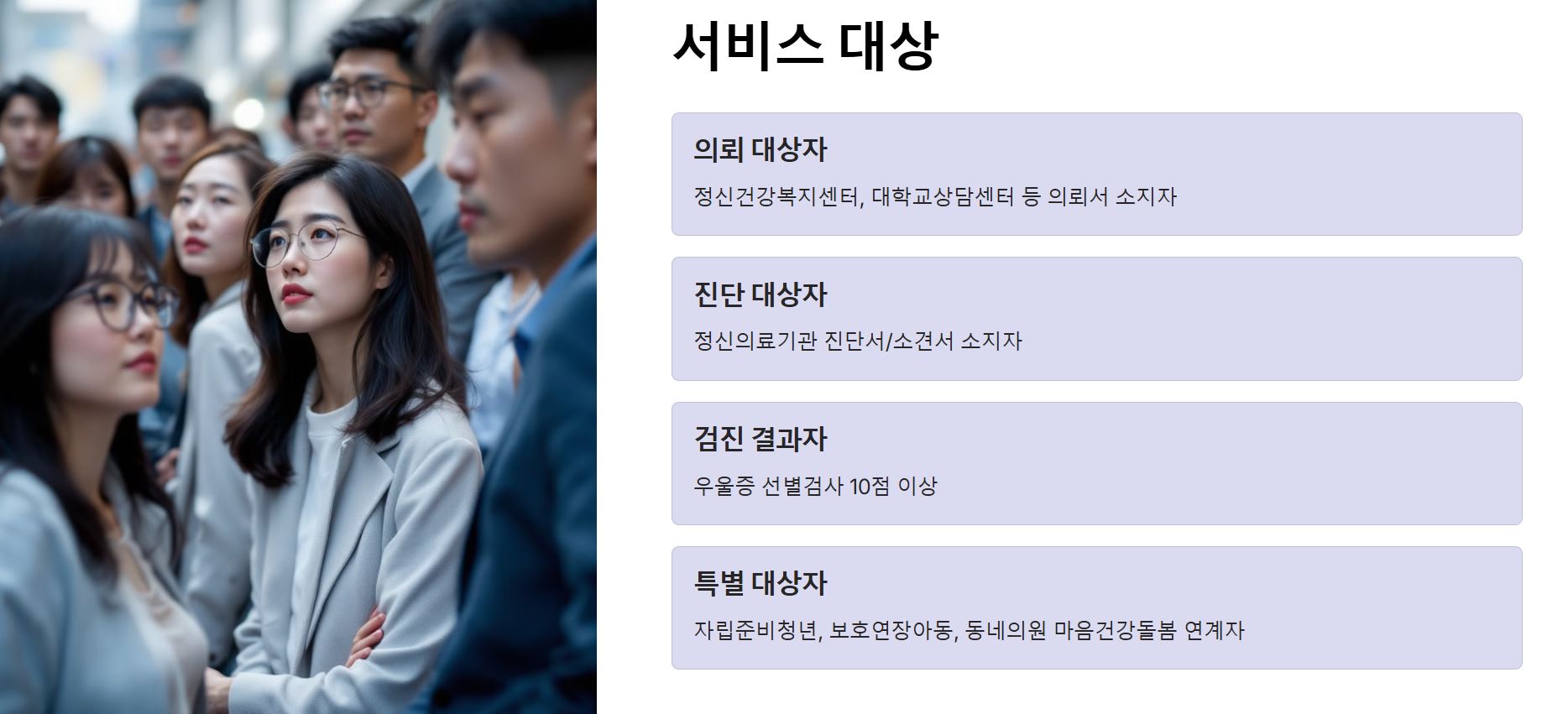 - 정신적 어려움을 겪고 있는 모든 국민에게 열려 있습니다.