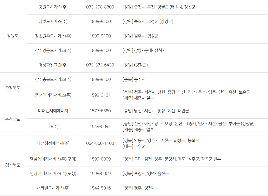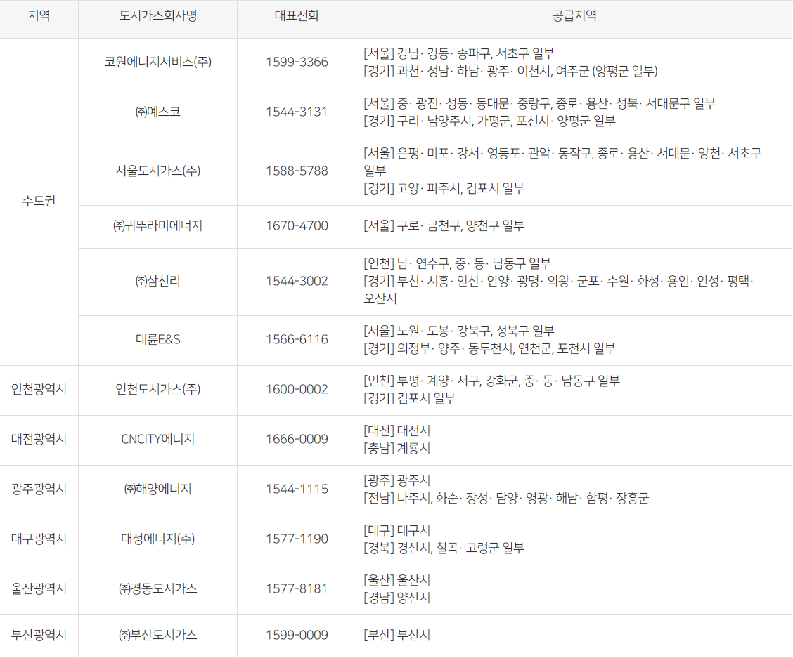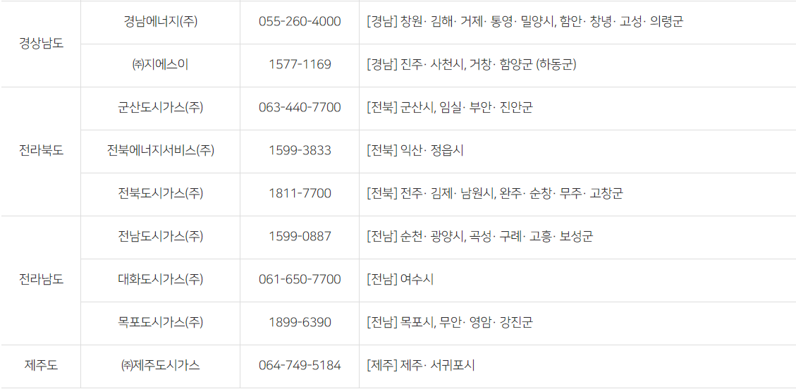 지역별 도시가스 회사 정보