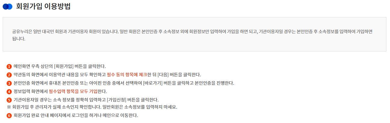 공유누리를 이용하기 위해서는 먼저 회원가입을 해야 합니다. 회원가입 방법은 다음과 같습니다: