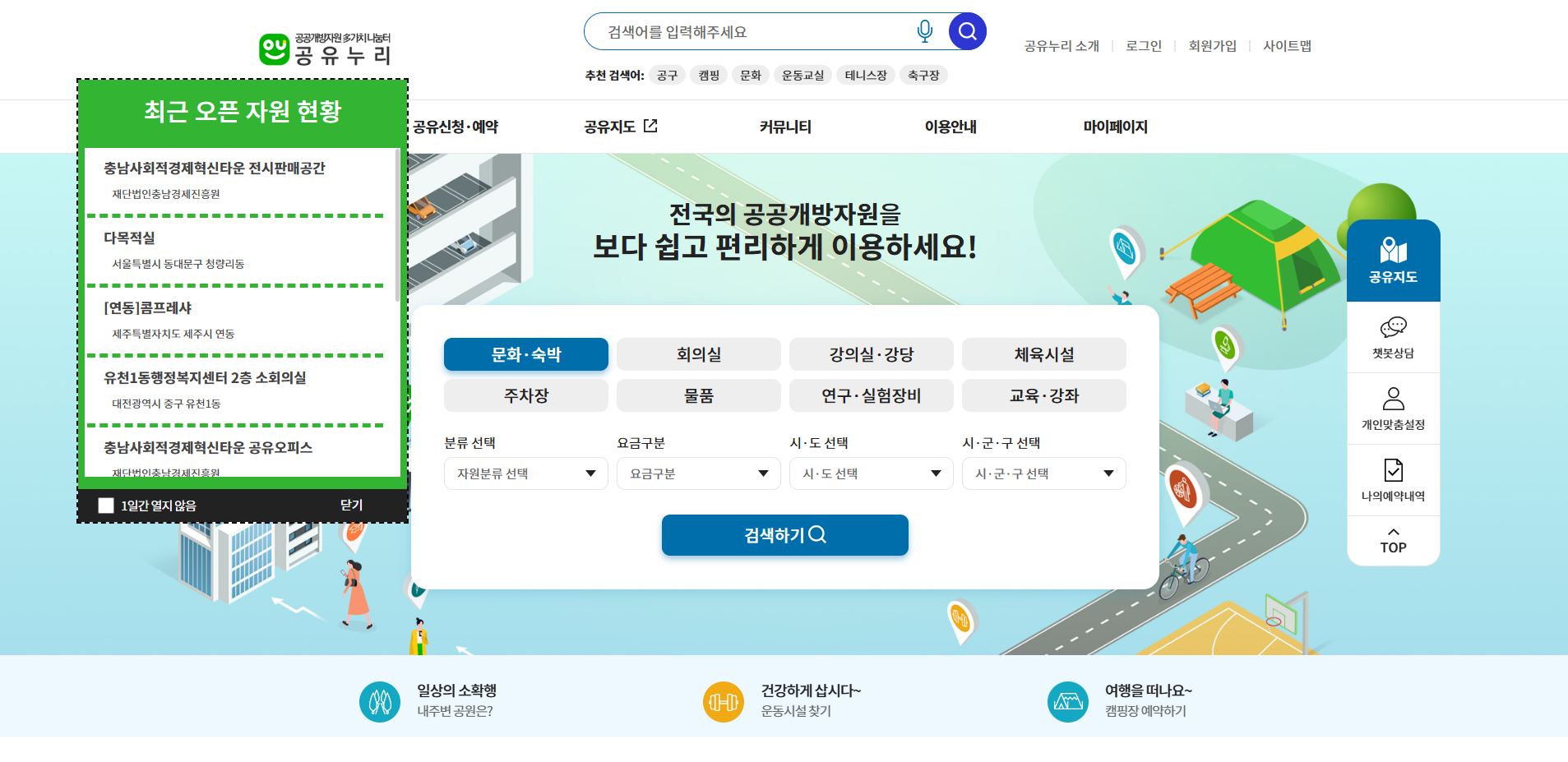 '프리한 19' 프로그램에 소개되어 더욱 많은 관심을 받고 있는 대국민 공공개방지원 공유서비스 포털 '공유누리'에 대해 알아보도록 하겠습니다. 공유누리는 전국의 공공개방자원을 보다 쉽고 편리하게 이용할 수 있도록 돕는 플랫폼입니다. 이 서비스는 문화, 숙박, 회의실, 강의실, 체육시설, 주차장, 물품, 연구 및 실험장비, 교육 및 강좌 등 다양한 자원을 제공합니다. 이제 공유누리의 주요 기능과 이용 방법에 대해 자세히 살펴보겠습니다.
