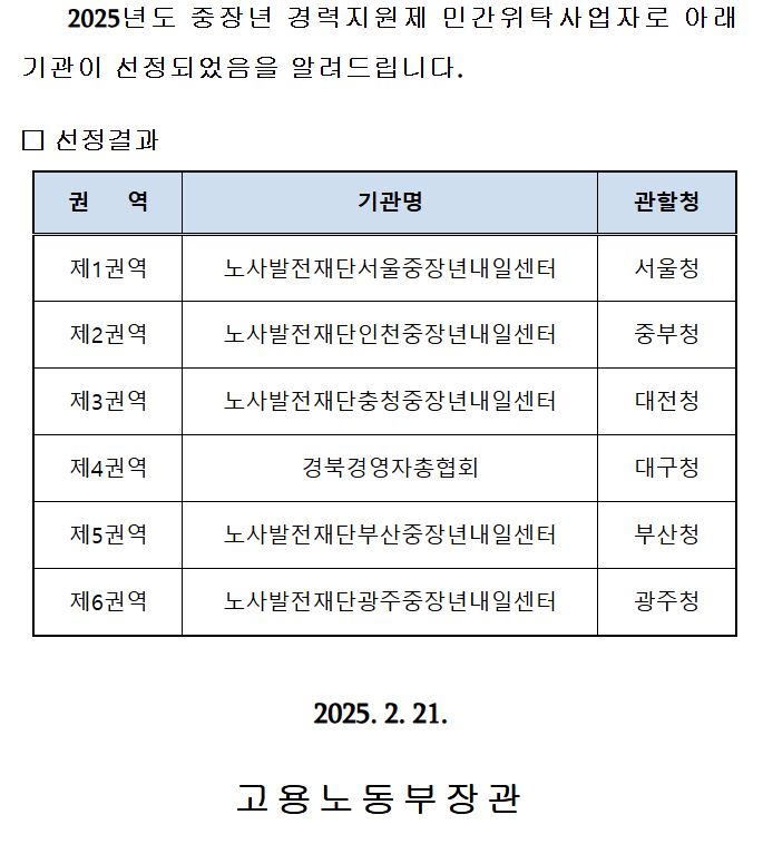 - 중장년경력지원제 뿐만 아니라, 중장년 취업에 관련된 정보는 중장년내일센터 블로그에서도 확인하실 수 있습니다.