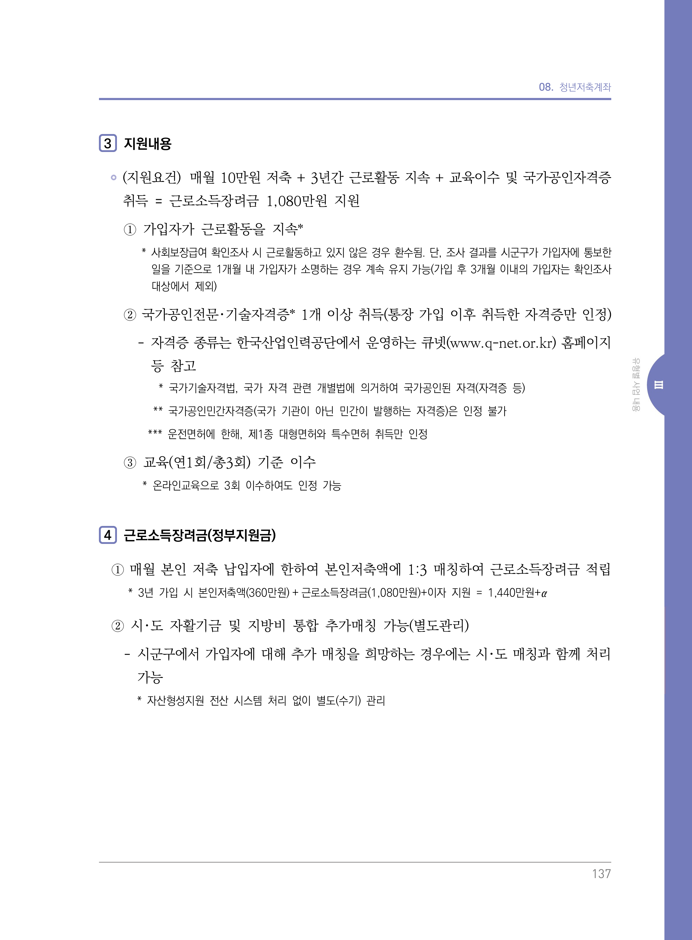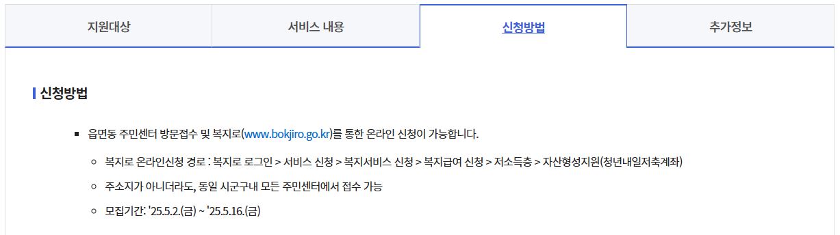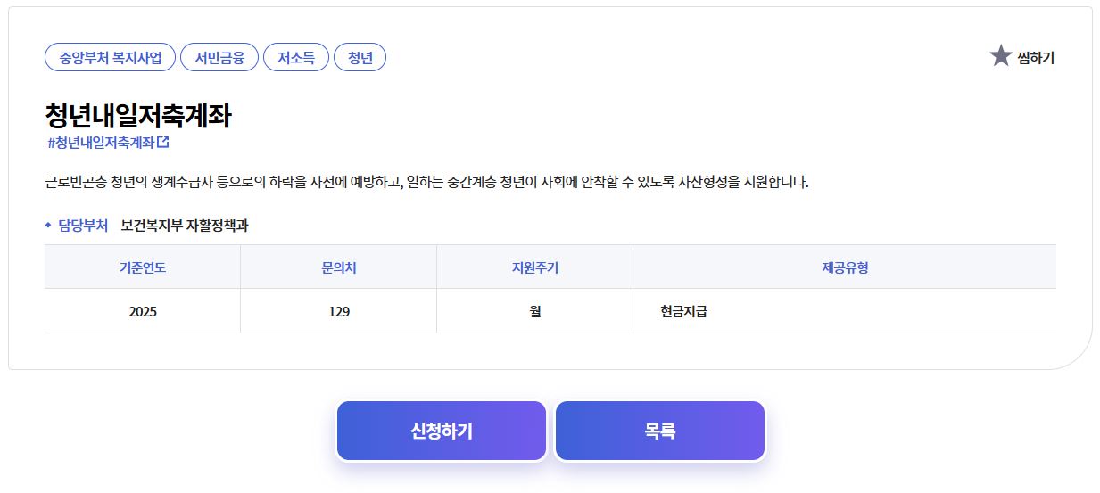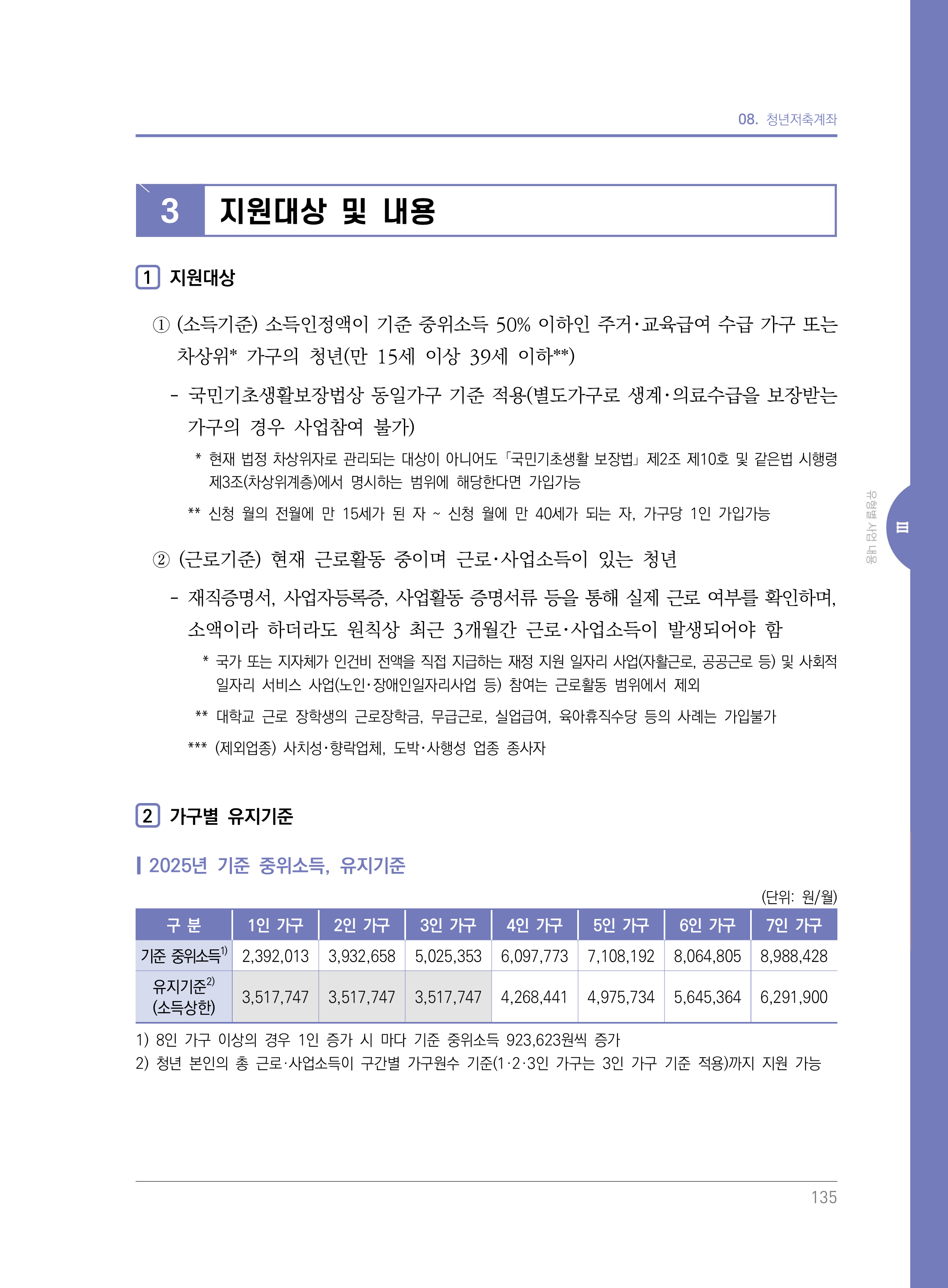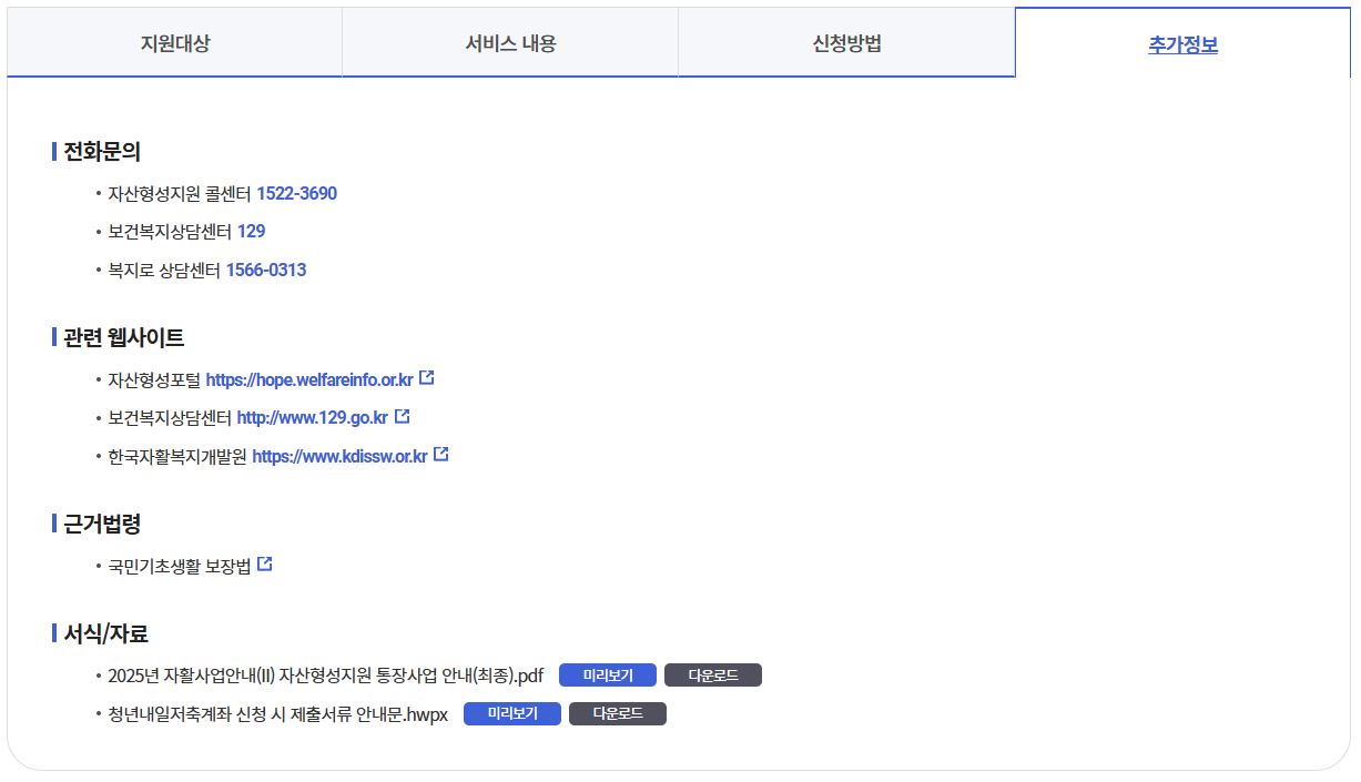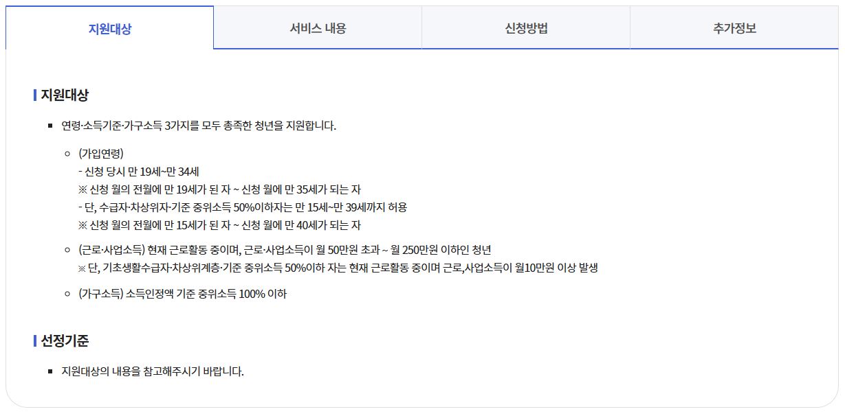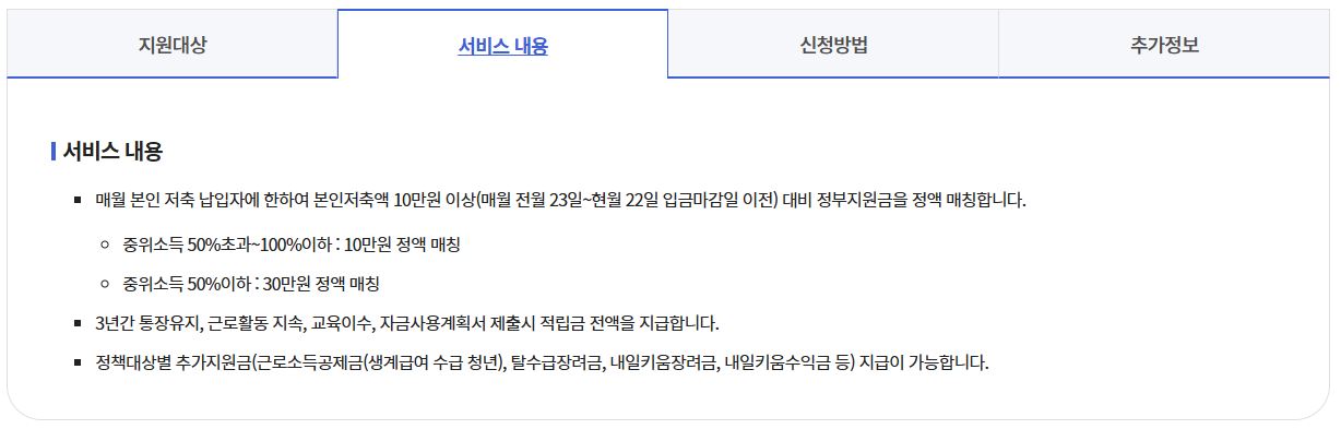 | 차상위계층 이하 | 기준 중위소득 50% 이하, 만 15~39세 | 월 10만 원 저축 시 정부 30만 원 매칭 |