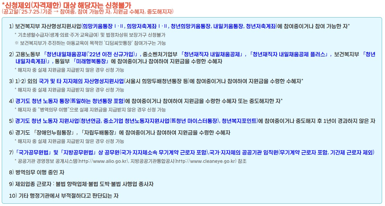 💡 신청 제외 대상도 있습니다. 예를 들어, 다른 정부 자산형성 사업(청년내일채움공제, 희망키움통장 등) 수혜자나 현재 공무원, 공공기관 정규직 등은 신청이 제한됩니다.