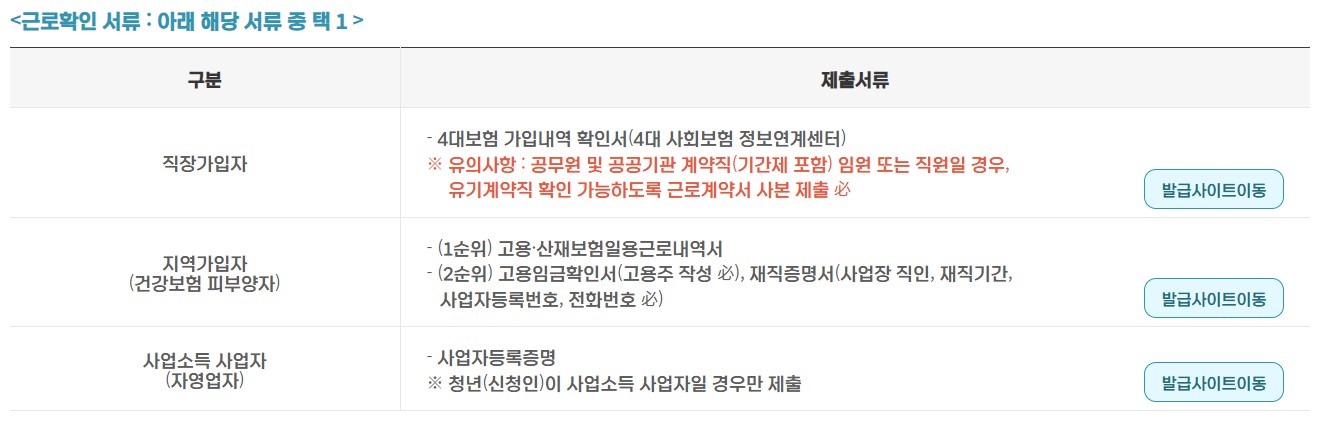 - 근로확인 서류: 4대보험 가입내역서, 고용임금확인서, 사업자등록증명 등