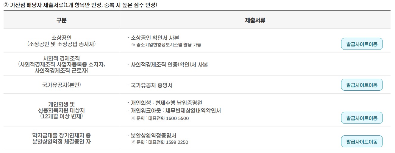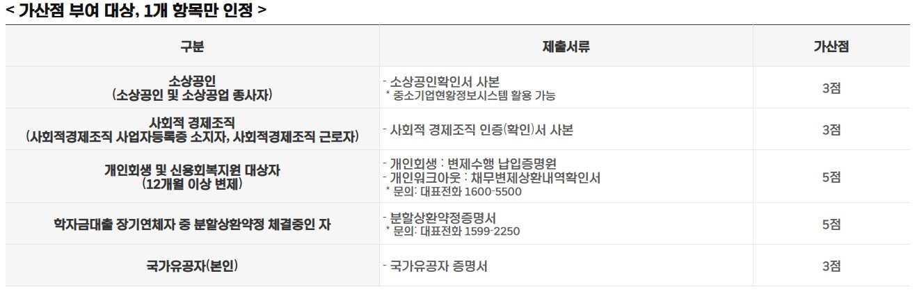 ※ 가산점 대상자(소상공인, 신용회복자 등)는 해당 증빙서류 추가 제출 시 가산점 최대 5점까지 인정됩니다.