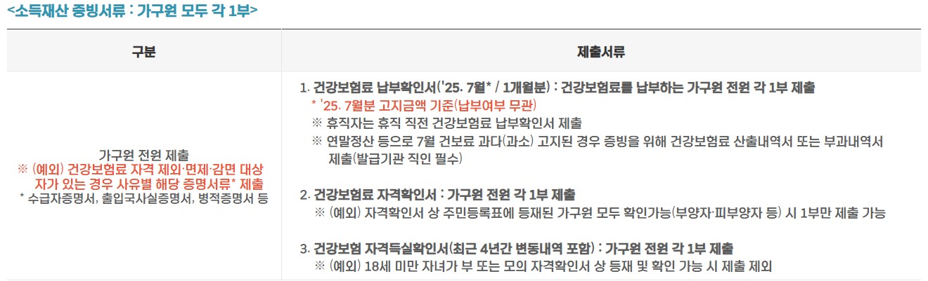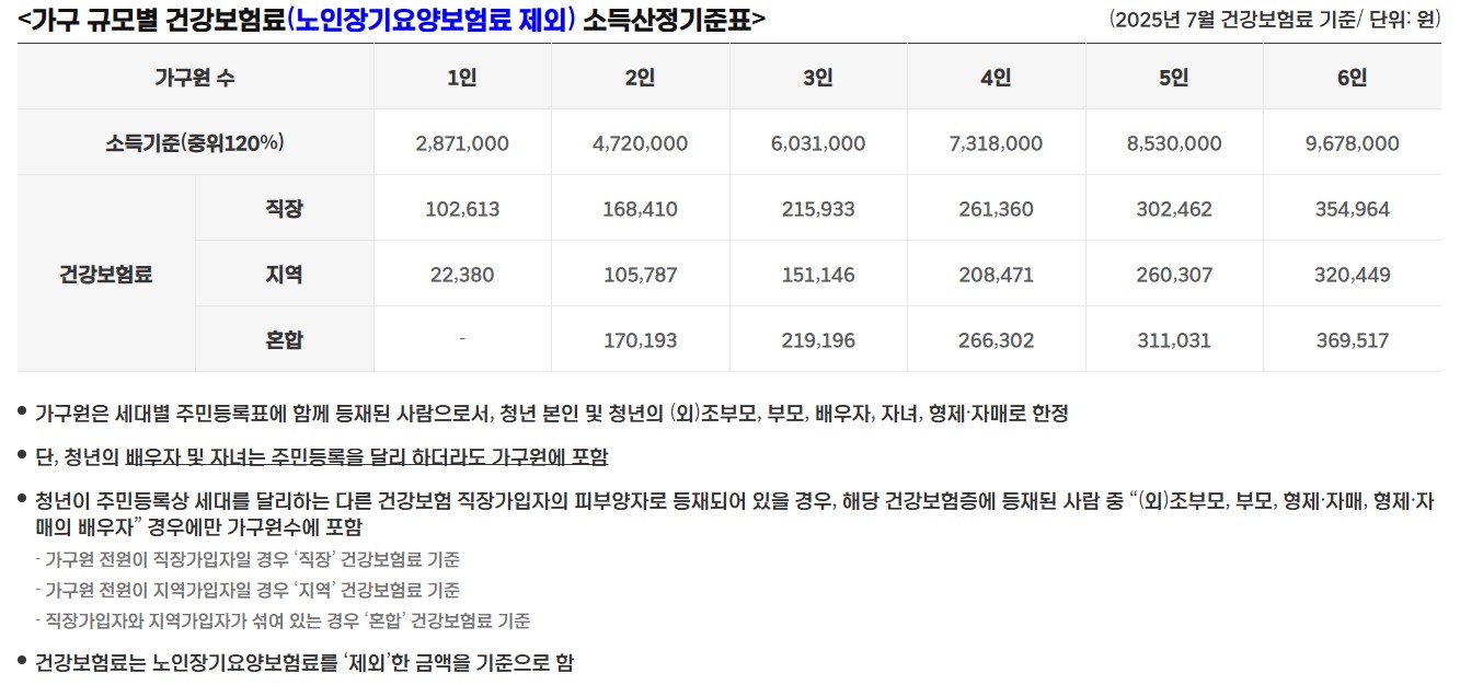 | 소득 기준 | 기준 중위소득 120% 이하 (2025년 7월 건강보험료 기준) |