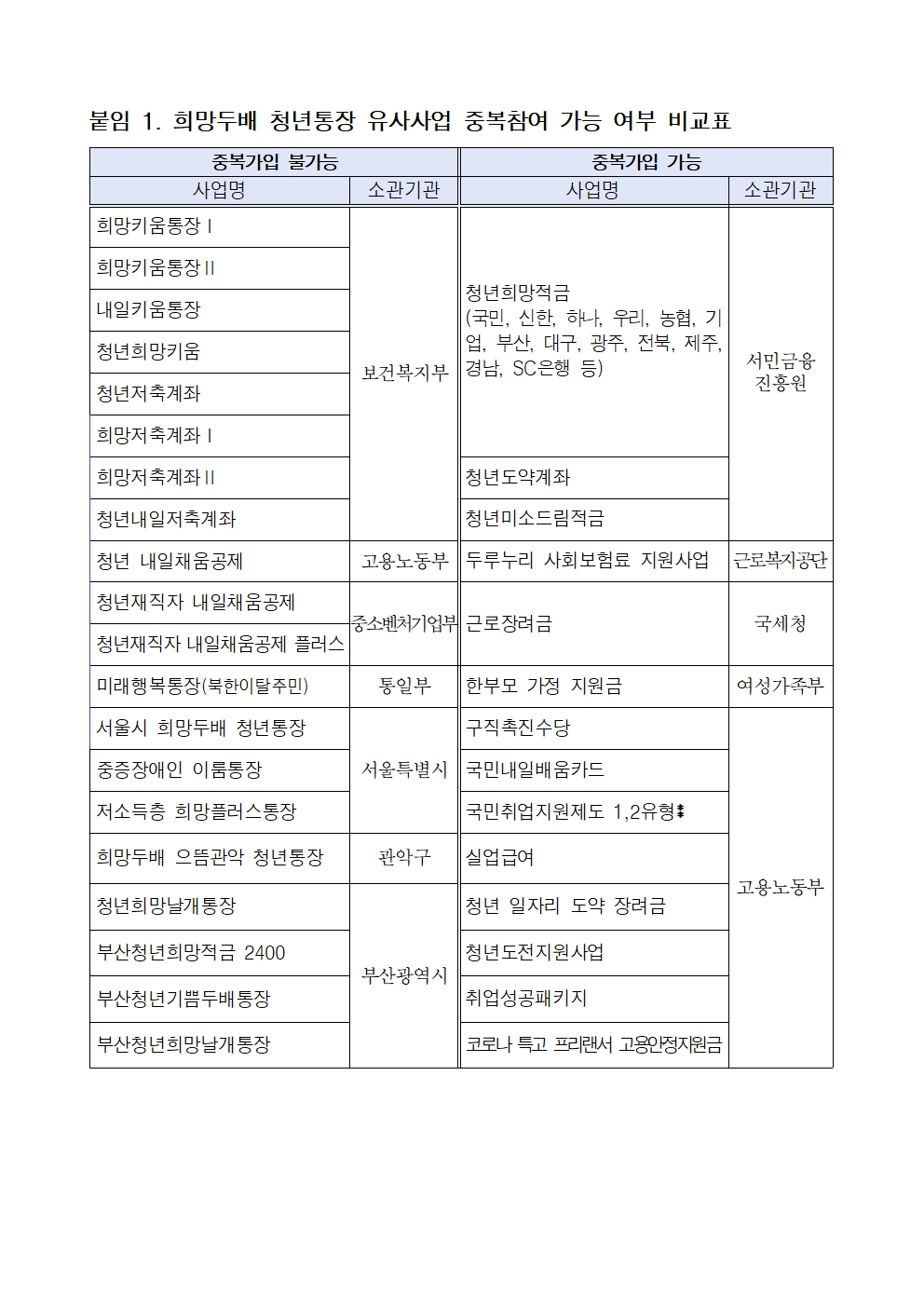 동일 사업 중복 참여는 불가능합니다. 단, ‘희망두배 청년통장’과 ‘꿈나래 통장’은 서로 다른 사업이므로, 자격 조건이 된다면 각각 신청 가능합니다.