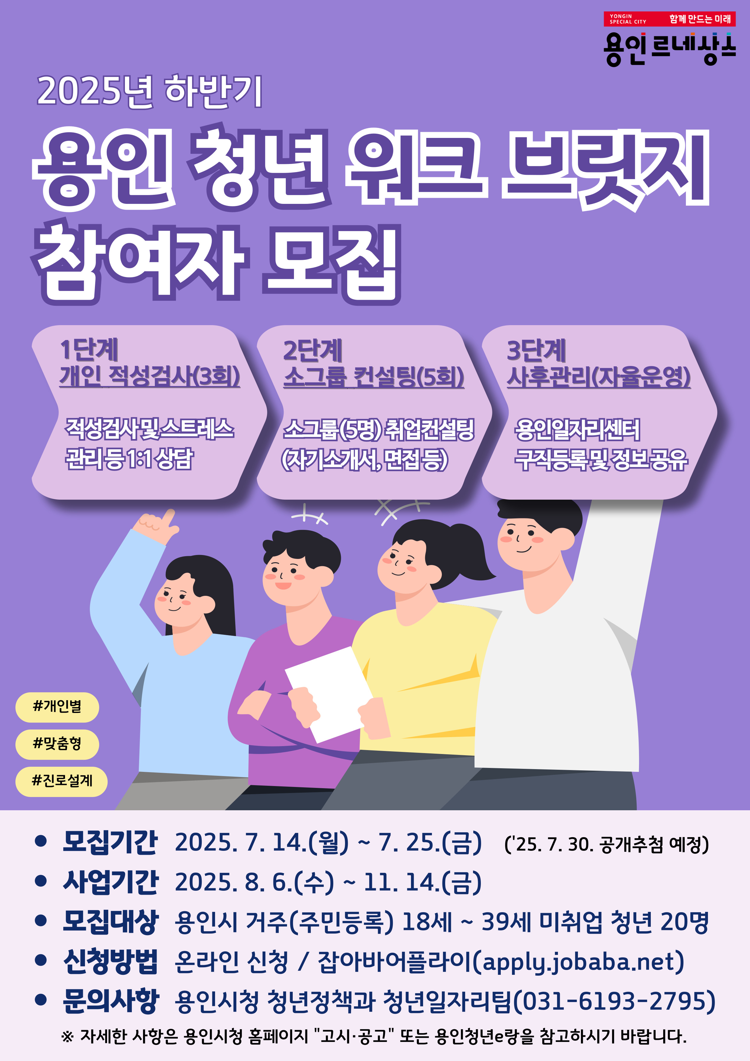 단 8주 만에 진로 방향부터 취업 전략까지 세울 수 있는 프로그램이 있다면요? 용인시가 야심차게 준비한 ‘청년 워크 브릿지’ 하반기 참여자 모집이 시작됐습니다. 자기 적성에 맞는 진로를 직접 설계하고, 전문 컨설팅까지 받을 수 있는 기회! 단 20명만 선발되니 놓치지 마세요.