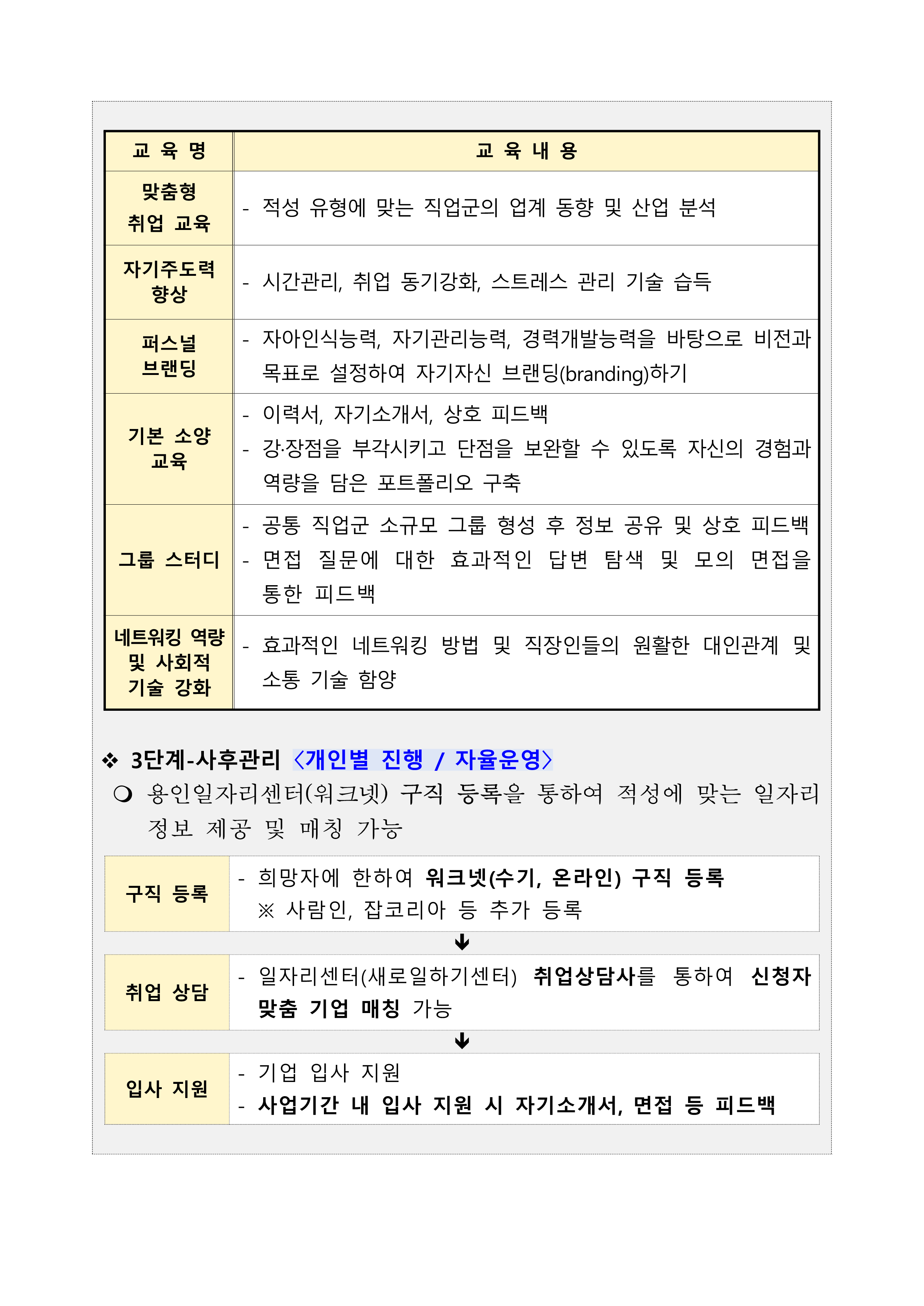 ③ **사후관리**: 워크넷 등록, 일자리센터 연계 상담 및 실전 취업 준비
