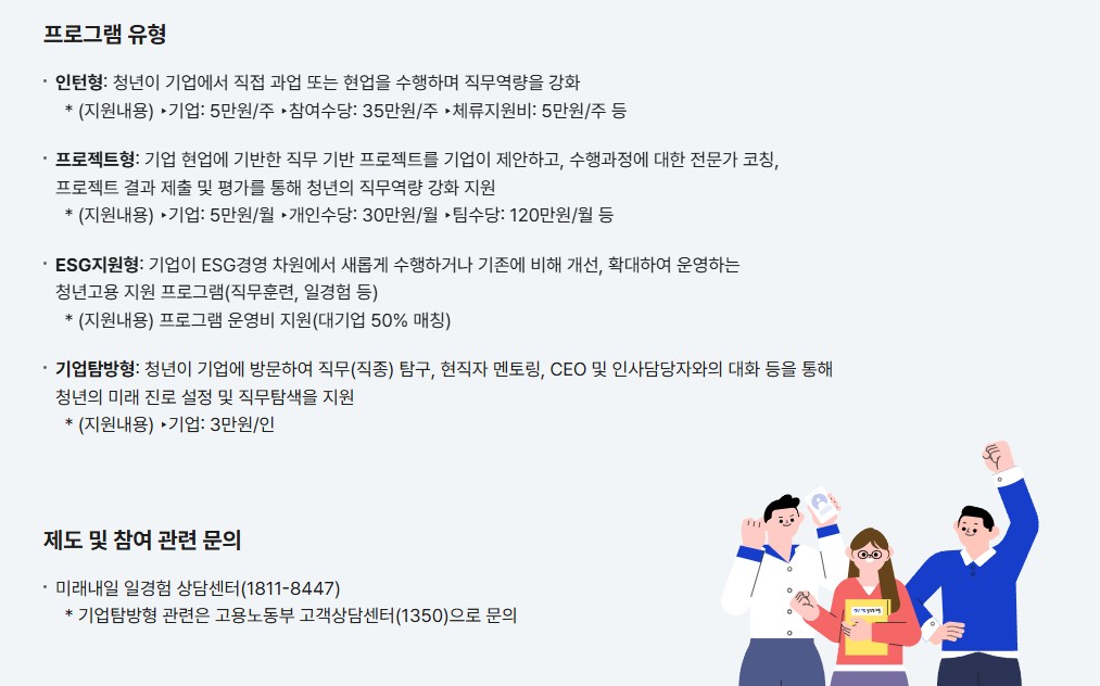 | ESG지원형 | ESG 관련 프로젝트, 직무훈련 참여 | 기업 운영비 일부 지원 (대기업 50% 매칭) |