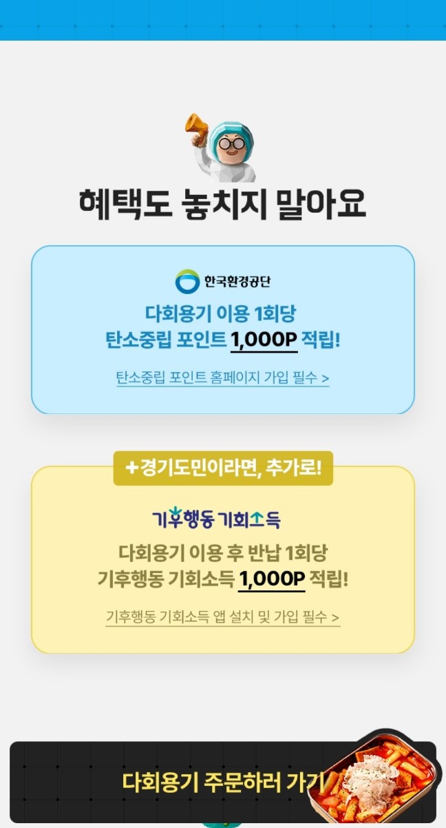 배달로 인한 플라스틱 쓰레기 문제를 해결하기 위해, 올해부터 다회용기로 배달을 시키면 2,000원을 돌려받을 수 있어요. 현재는 일부 지역에서만 시범 운영 중이지만, 곧 전국으로 확대될 예정입니다.