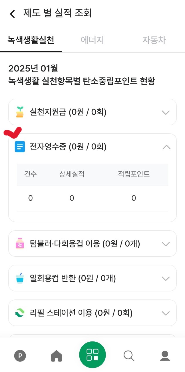 어플 '카본페이'를 다운로드를 받아 로그인을 진행 한 후, 아래 메뉴에서 맨 왼쪽에 있는 P 를 선택을 하면 아래처럼 '전자영수증' 메뉴가 보입니다. 마트나 편의점의 어플을 다운로드 받아 '모바일 영수증'을 설정을 해두면, 카본페이 전자영수증 메뉴에 100원씩 쌓이는 것을 확인하실 수 있습니다.