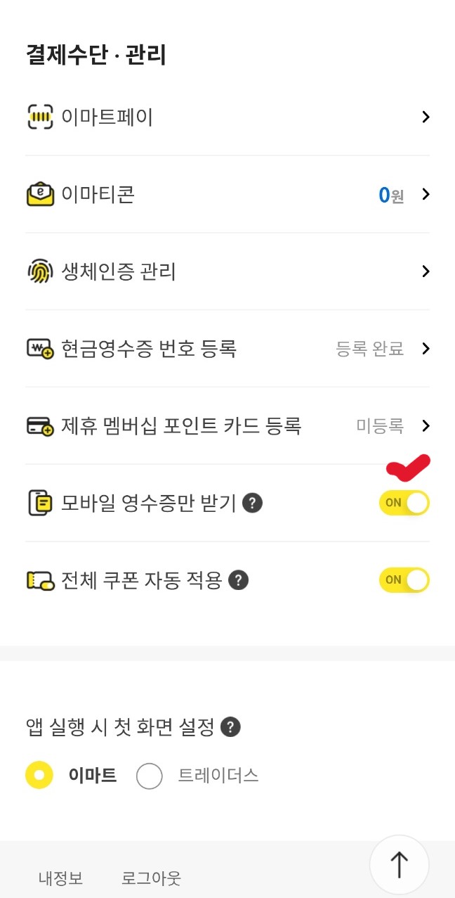 마트에서 장을 볼 때 종이 영수증 대신 전자 영수증을 선택해보세요. 전자 영수증 한 건당 100원씩 포인트가 적립됩니다. 해당 마트 앱을 설치하고 로그인한 후, 모바일 영수증 기능을 켜두세요. 단, 포인트를 받으려면 탄소 중립 실천 포인트에 가입해야 해요.