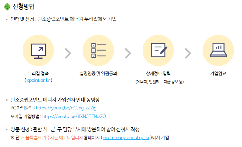 서울 시민들은 에코 마일리지로 비슷한 혜택을 받을 수 있어요. 신청 방법은 탄소포인트와 거의 같아요. 이름만 다를 뿐, 혜택은 동일해요. 서울은 신청 기간 제한 없이 바로 적용됩니다.