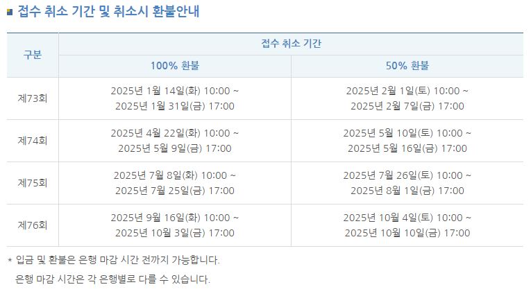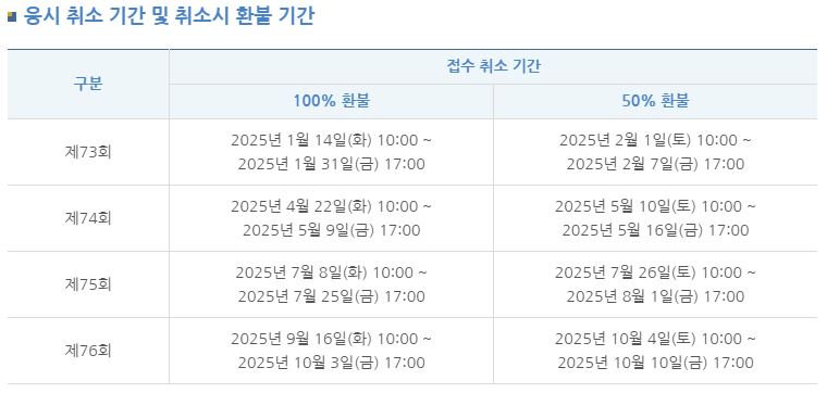 응시 수수료는 접수 기간 내 취소 시 전액 환불이 가능하며, 이후 지정된 취소 기간 내에는 50% 환불이 가능합니다. 단, 접수 기간 이후에는 환불이 제한되므로, 일정 변경이나 응시 포기를 고려하는 수험생은 반드시 해당 기간을 확인해야 합니다.