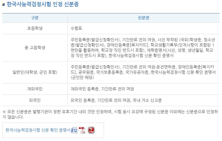 시험 응시를 위한 신분증은 필수이며, 인정되는 신분증 종류는 다음과 같습니다. 초등학생은 수험표로 신분 확인이 가능하지만, 중·고등학생과 일반인은 주민등록증, 여권, 학생증 등 공식 신분증을 지참해야 합니다. 신분증 미지참 시 시험 응시가 불가능하므로 반드시 확인해야 합니다.