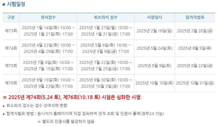 한국사능력검정시험은 공무원 시험, 교사 임용, 대학 입시 등 다양한 분야에서 필수 자격으로 자리 잡았습니다. 특히 제74회 시험은 2025년 5월 24일(토)에 심화 과정만 시행되므로, 응시를 계획 중인 수험생들은 반드시 일정을 확인하고 준비해야 합니다. 체계적인 학습과 전략적인 접근으로 목표 등급을 달성해보세요.