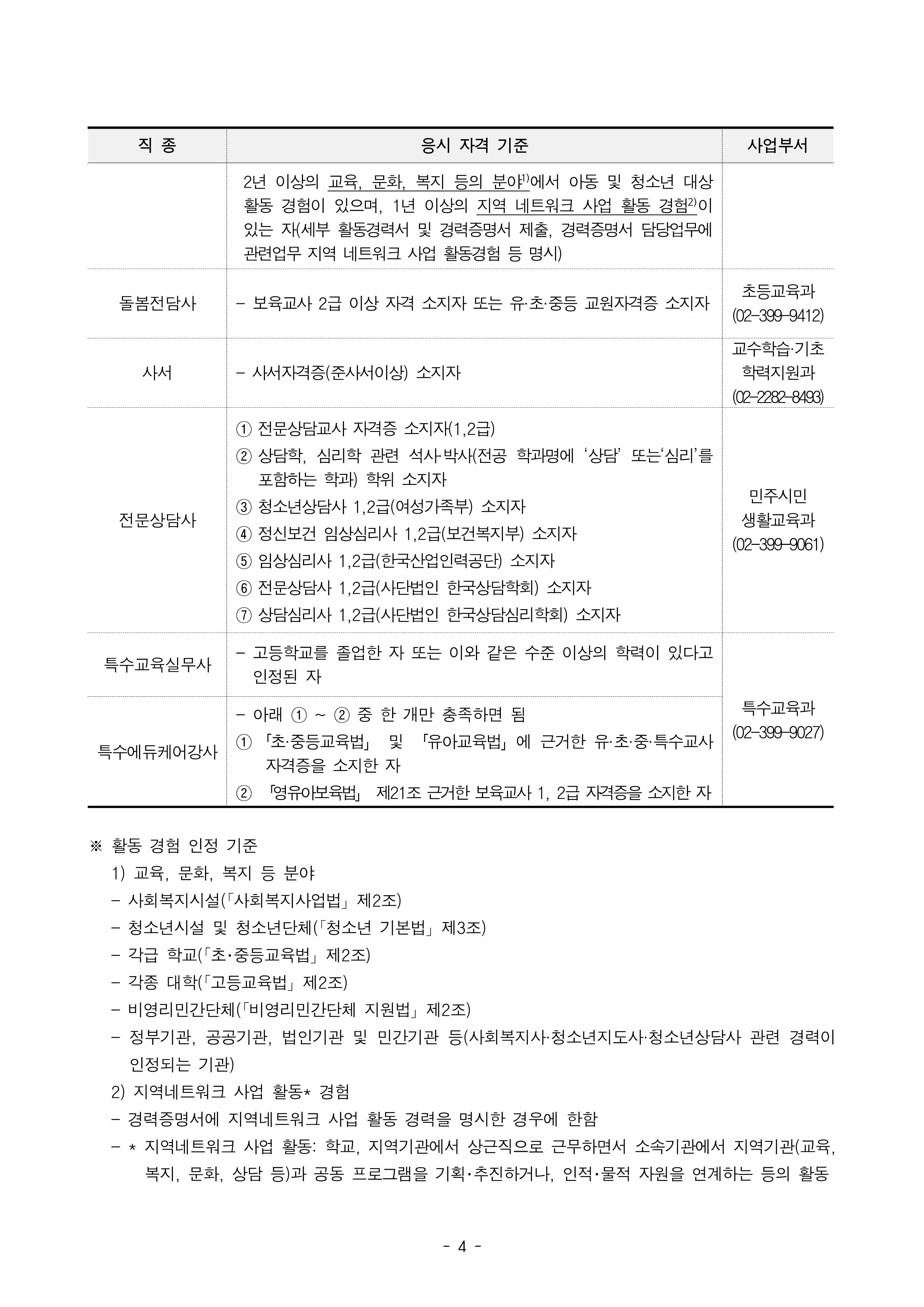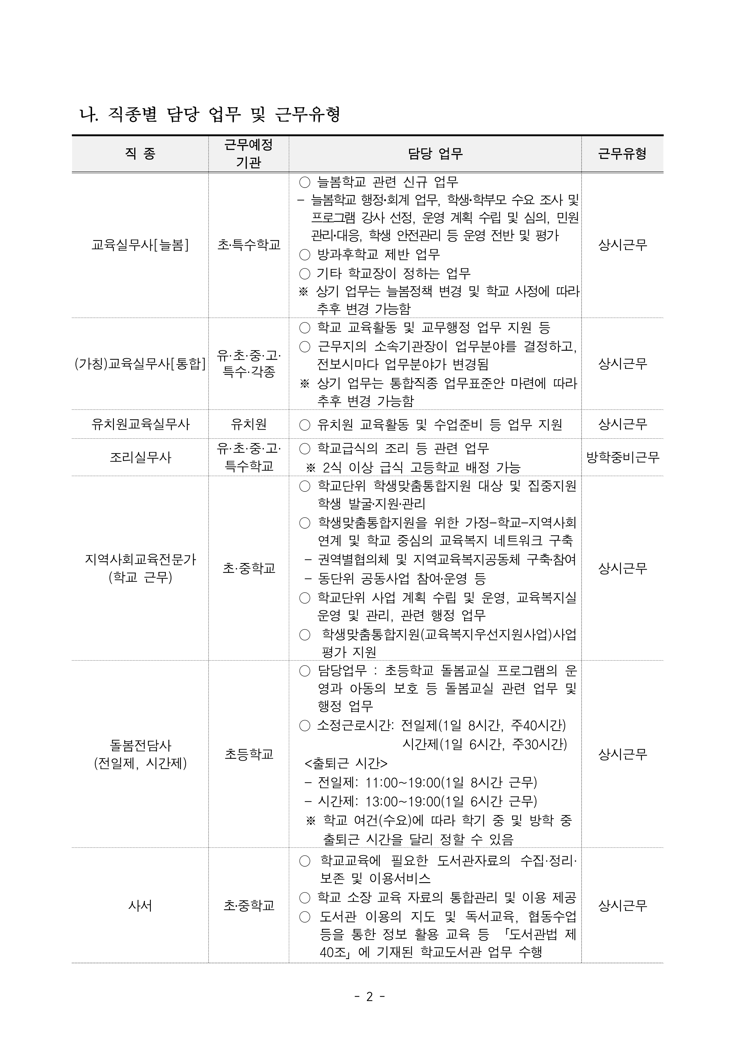 직종별 공통사항: 세부적인 담당업무, 출퇴근시간(시험, 종업시간), 장소 등은 배치 기관(학교) 실정에 따라 기관(학교)장이