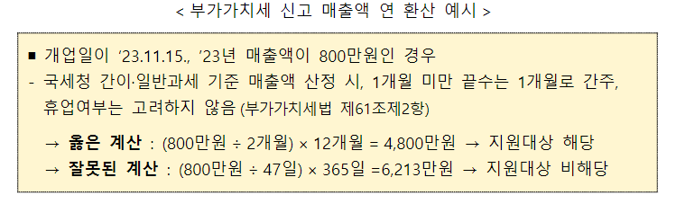 - 다만, 22~23년 연중 개업한 경우, 개업 이후 월 평균 매출액을 연환산
