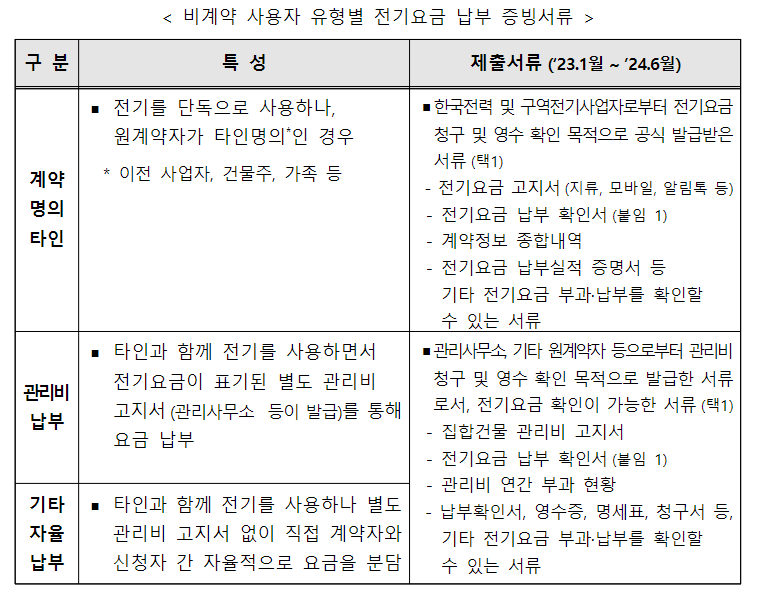신청자 정보 입력, 유형별 전기요금 납부 증빙서류
