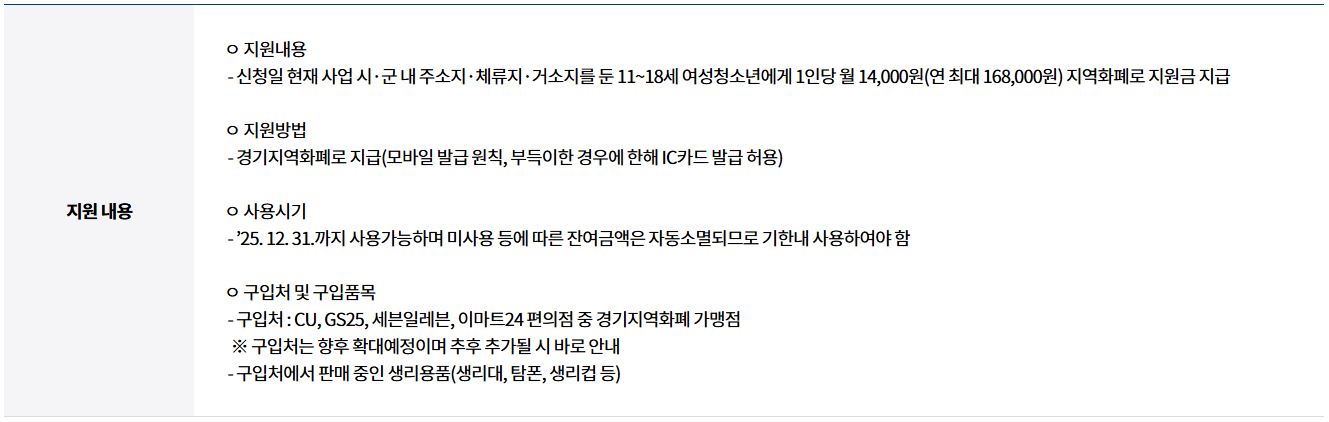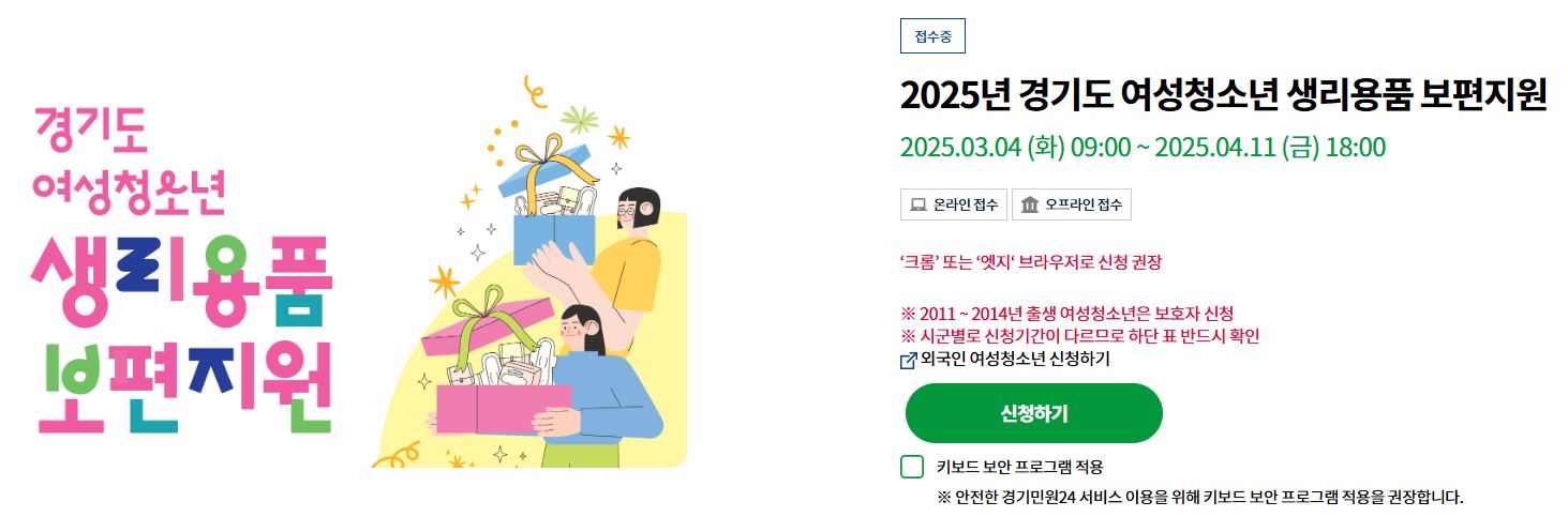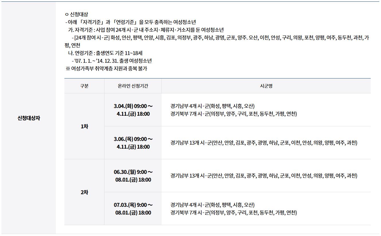 신청 대상자는 경기도에 거주하는 만 11세부터 18세까지의 여성청소년입니다. 다만, 생리용품을 필요로 하는 청소년이 보호자와 함께 신청할 수 있으며, 가족의 소득 수준에 따라 지원 여부가 결정됩니다. 즉, 저소득 가구의 청소년에게 우선 지원이 이루어집니다.